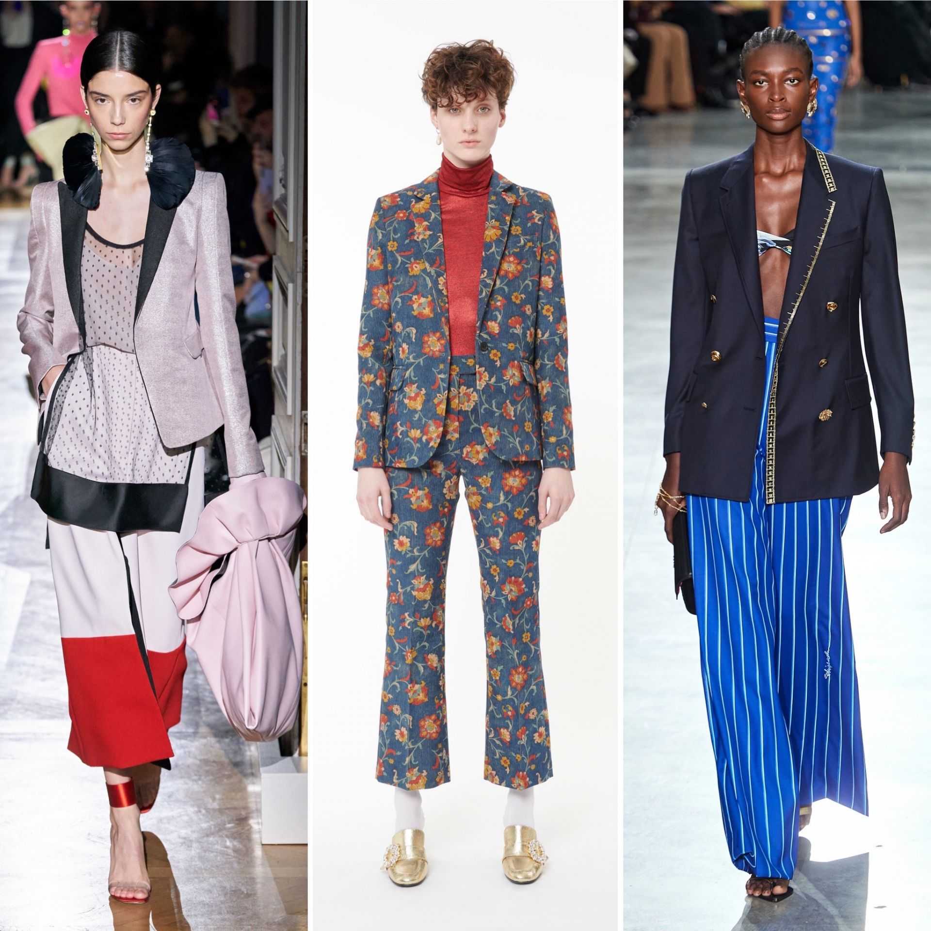 В 2020 году станут модными брючные костюмы с принтами. Костюмы такого дизайна советуют сочетать с кроссовками, ковбойскими сапогами и интересными моделями сумок. Чем больше правил традиционной моды вы нарушите, тем интереснее будет выглядеть ваш образ. Цветочный принт на брючном костюме поможет расширить границы привычной классики. Костюм яркого цвета или необычного фасона станет основой эффектного вечернего образа.