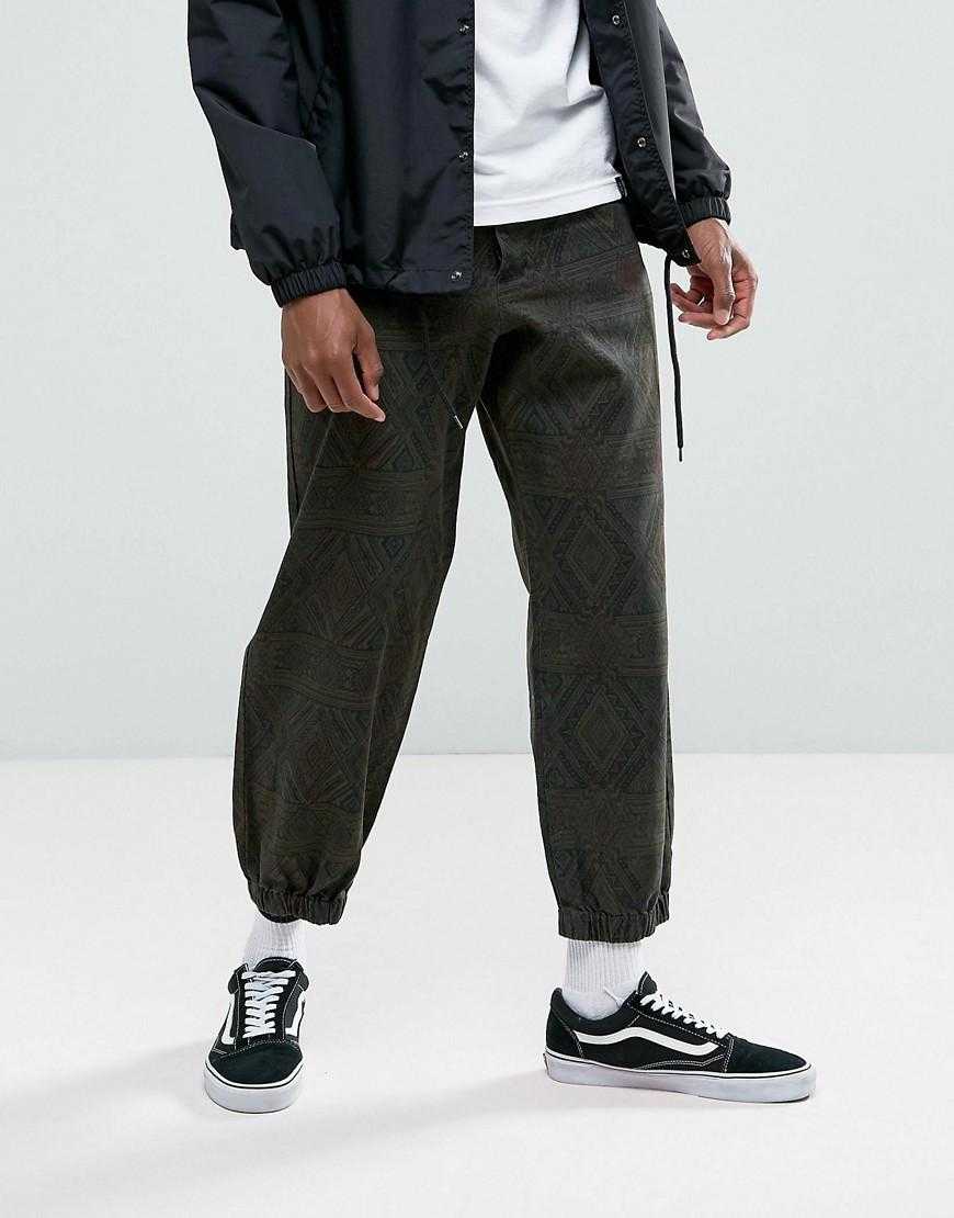 Джоггеры больше напоминают спортивки с небольшими изменениями от дизайнеров. Главная особенность вещи – заниженная талия, свободная посадка, где штанина сужается книзу и заканчивается манжетом на щиколотке.