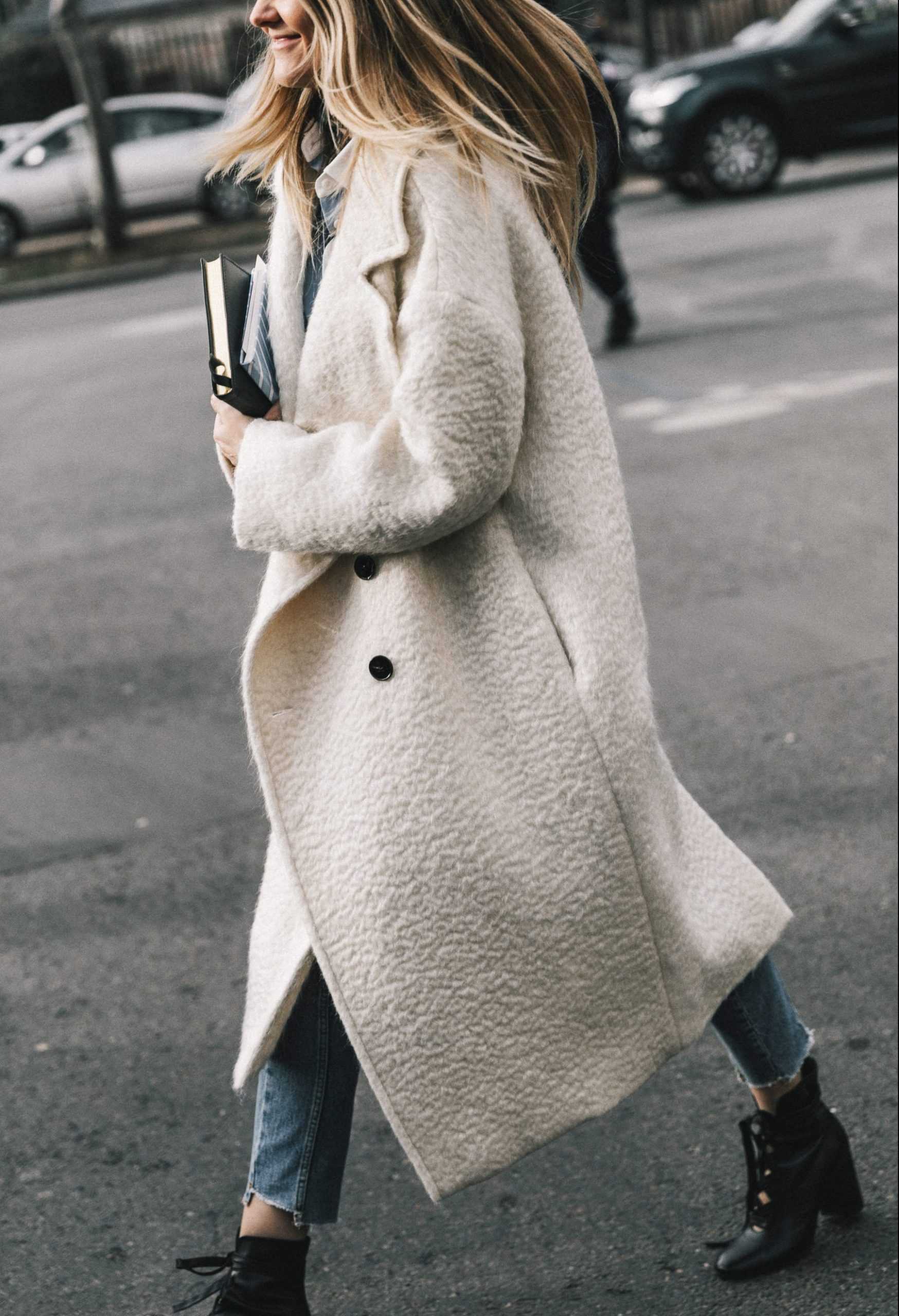 Можно сделать образ необычным, если носить пальто оверсайз с джинсами, у которых не обработан нижний отрез. Они называются брюками с джинсовой бахромой. Стройным и полным женщинам рекомендуется носить оверсайз с узкими джинсами с высокой посадкой. Они скрывают живот. Можно дополнить образ свитером с горлом. Оттенки не имеют значения, но их лучше сочетать так, чтобы они смотрелись гармонично