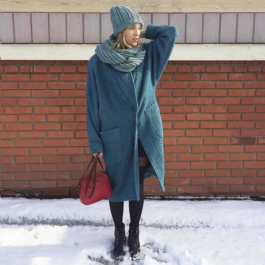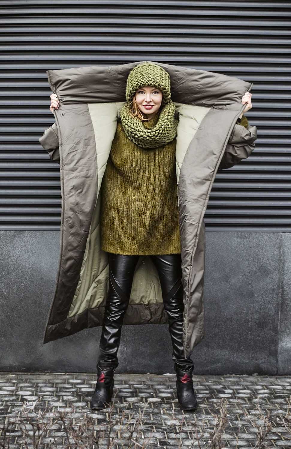 - Объемная вещь – только одна. Остальные должны с ней контрастировать. Если это свитер – брюки следует подбирать узкие, если пальто-кокон – то к нему подойдет платье-футляр. Аналогично, объемным может быть только верх или низ – не следует полностью превращаться во что-то абсолютно круглое.