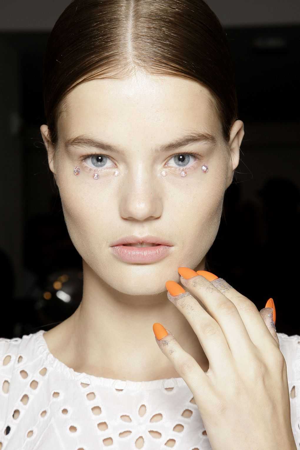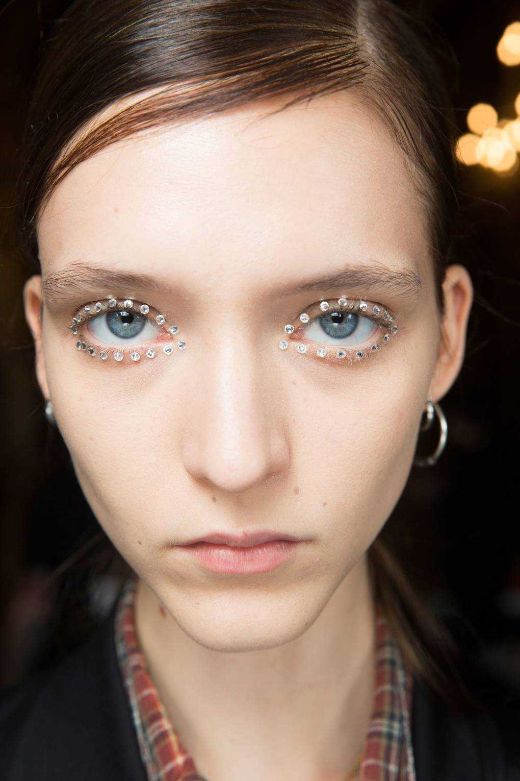 Оригинальный вариант макияжа 2018 с блестками – выложить несколько крупных блесток либо страз под нижним веком. Именно такой модный макияж весна-лето 2018 продемонстрирован на последних показах именитых дизайнеров.