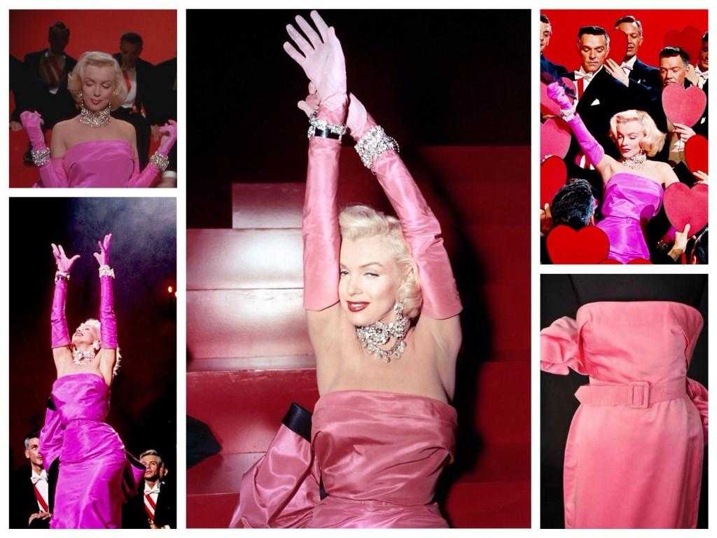 Это должно быть эталонное платье — красивое и сексуальное.За основу можно взять платья из кинофильмов, в которых снималась актриса. Например, розовое платье из шоу-выступления, которое использовалось для исполнения песни «Бриллианты – лучшие друзья девушек» в кинокартине «Джентльмены предпочитают блондинок». Облегающее, подчеркивающее формы ее тела, без бретелей, платье-футляр, дополненное розовыми перчатками, и всевозможными аксессуарами-колье, браслетами в соответствии с концепцией песни.