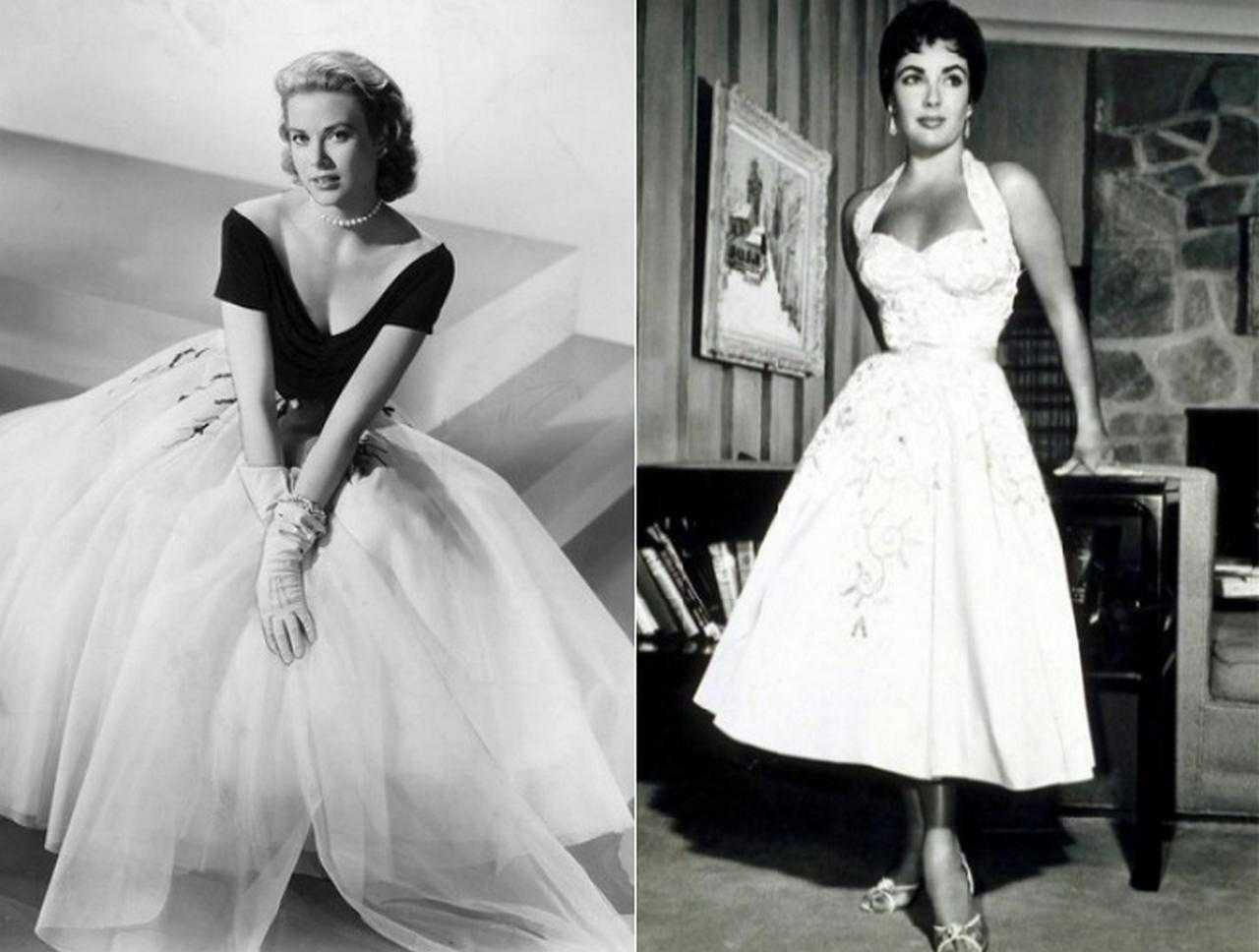 Классикой в одежде тех лет стали платья с пышной юбкой. Они удачно скрывали возможные недостатки фигуры, но не давали продемонстрировать стройные ножки. Девушки с идеальной фигурой отдавали предпочтение узким платьям. Их длина преимущественно была ниже колена.