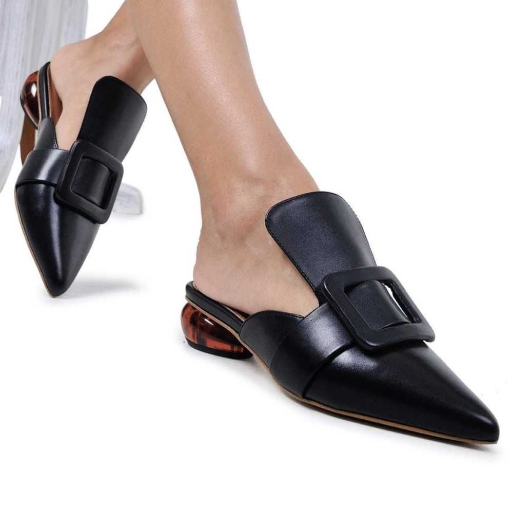 Обувка с открытой пяткой, которая держится на ножке женщины за счет верхней части – мюли. Идут без ремешка. Этой весной такой вариант туфлей предпочтительно выбирать с заостренным носком. Это мегапопулярный лук на показах у многих кутюрье