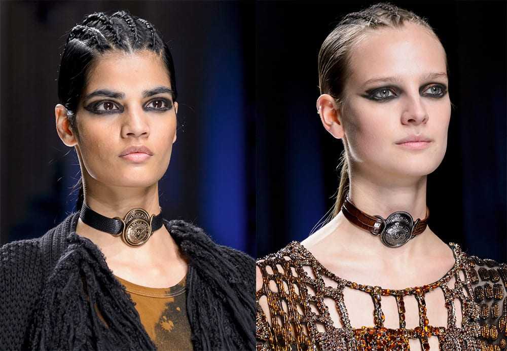 Чокеры. Модными станут чокеры с массивными украшениями в виде цветов или животных. Также стильно будут смотреться украшения из ярких и крупных камней. Многие дизайнеры предлагают бижутерию из метала в строгом геометрическом стиле.