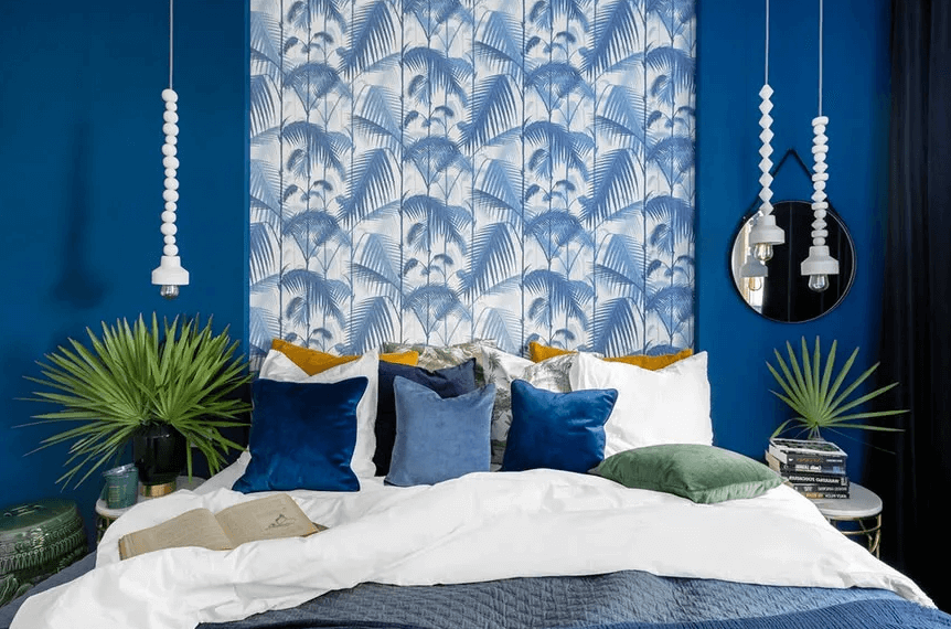 Classic Blue — прохладный оттенок, но яркие мазки теплых тонов решают эту проблему. Так что использовать синий цвет можно в любой комнате: