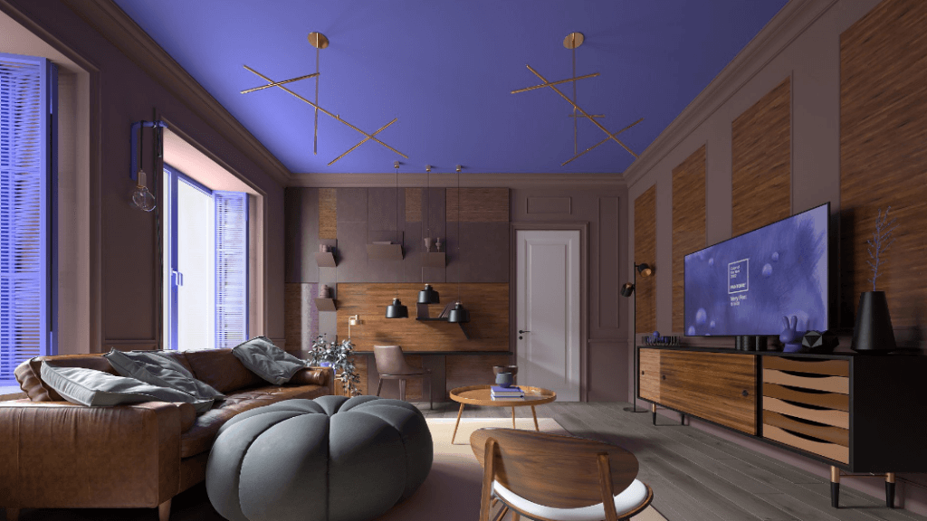 Very Peri считается идеально сбалансированным холодно-теплым оттенком. Но в совокупности с другими насыщенными тонами, он перегружает интерьер.