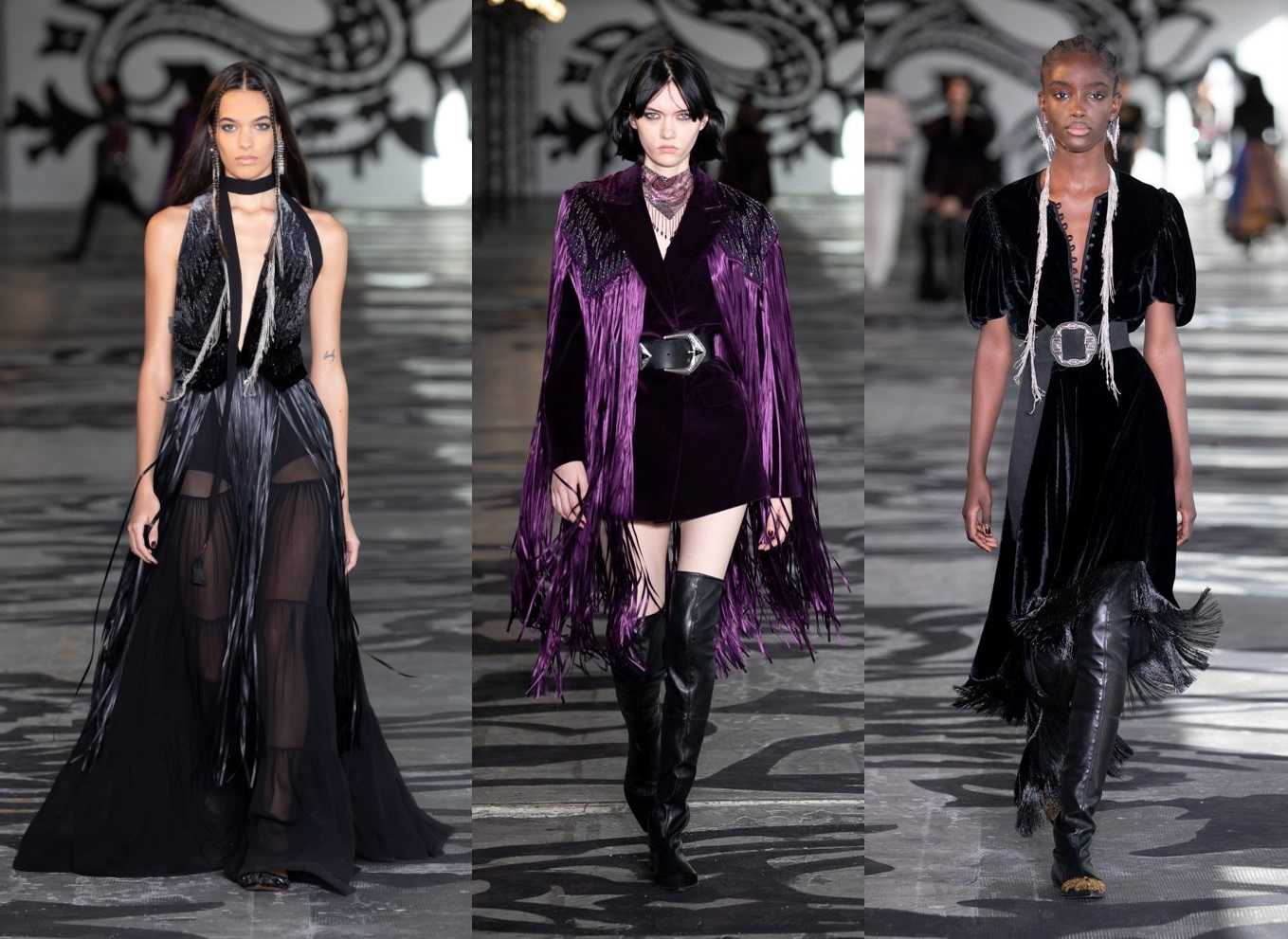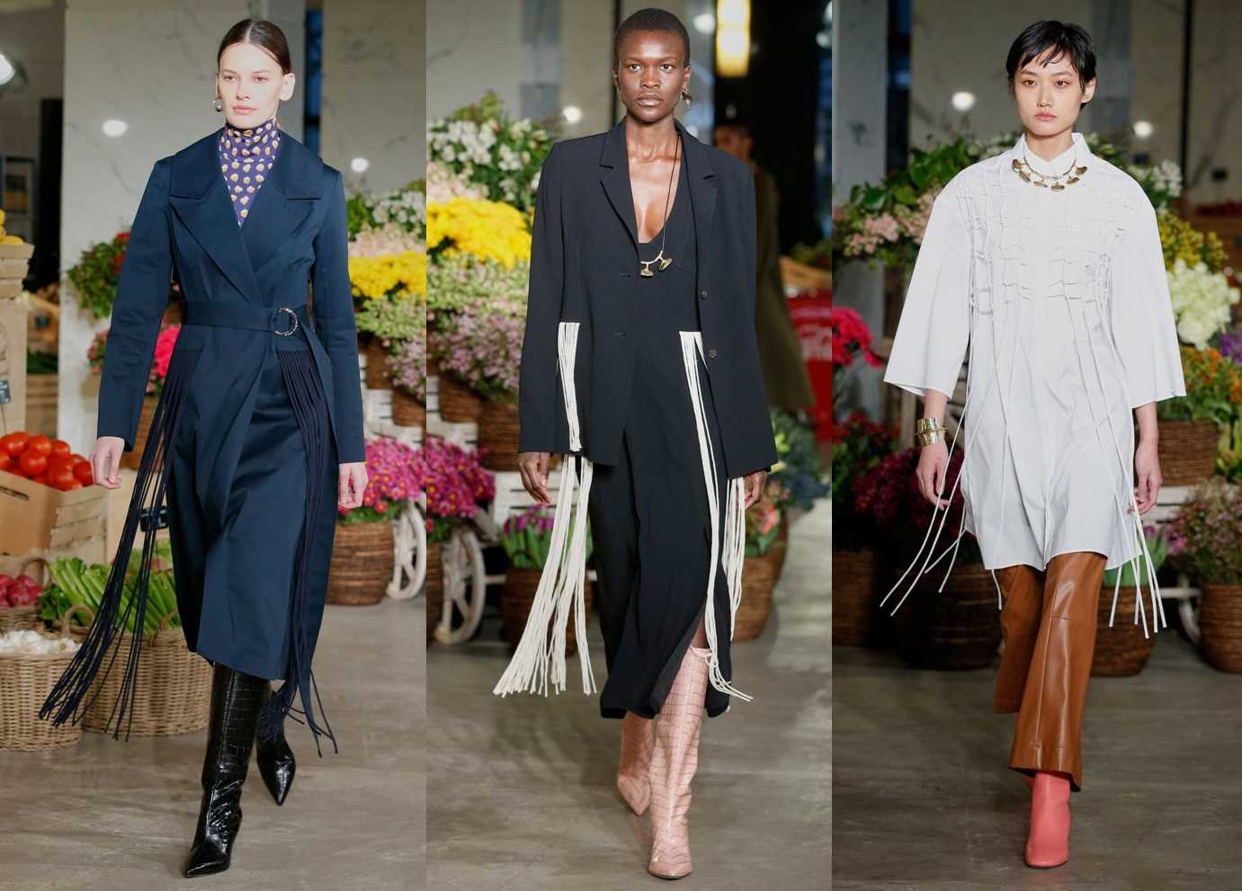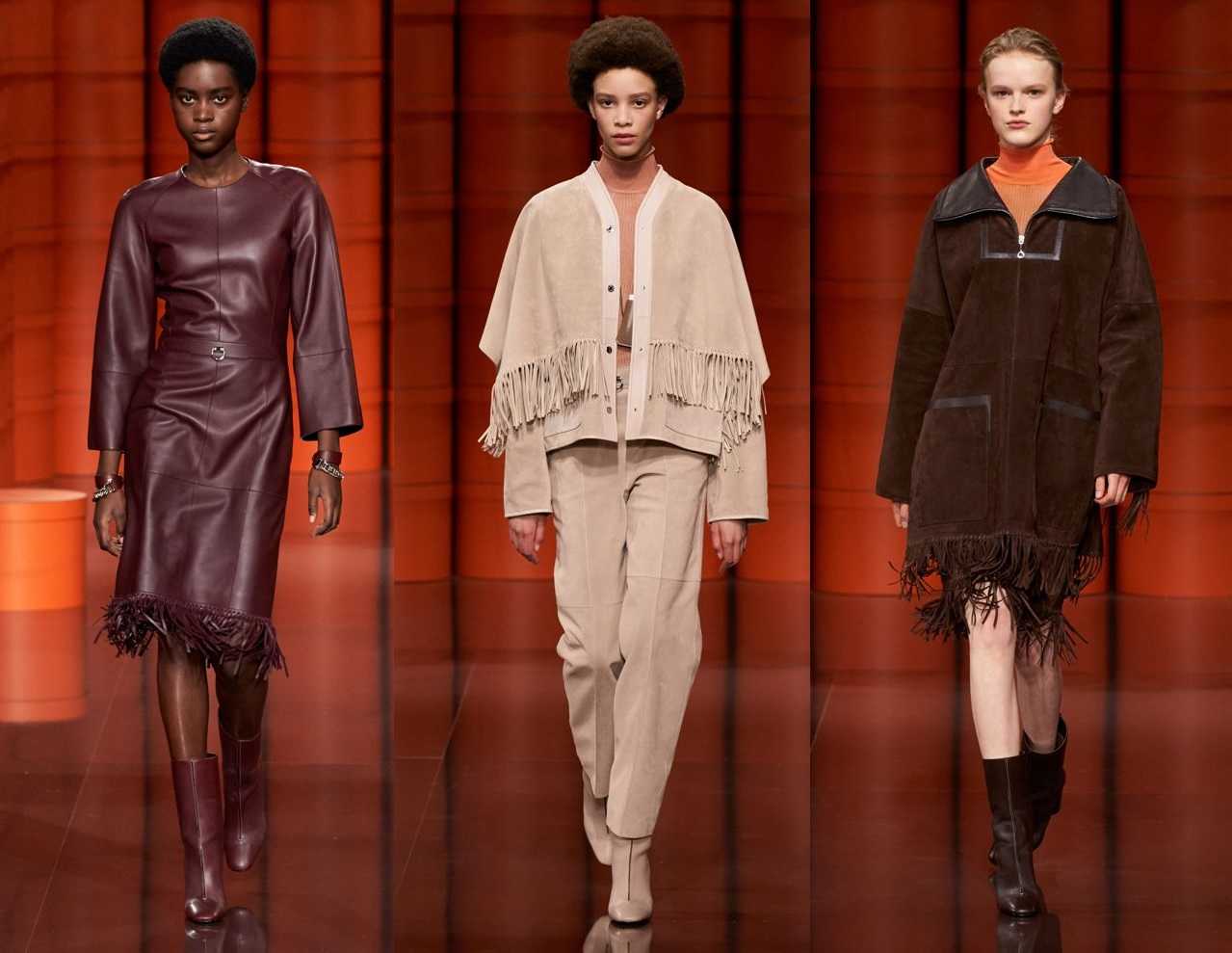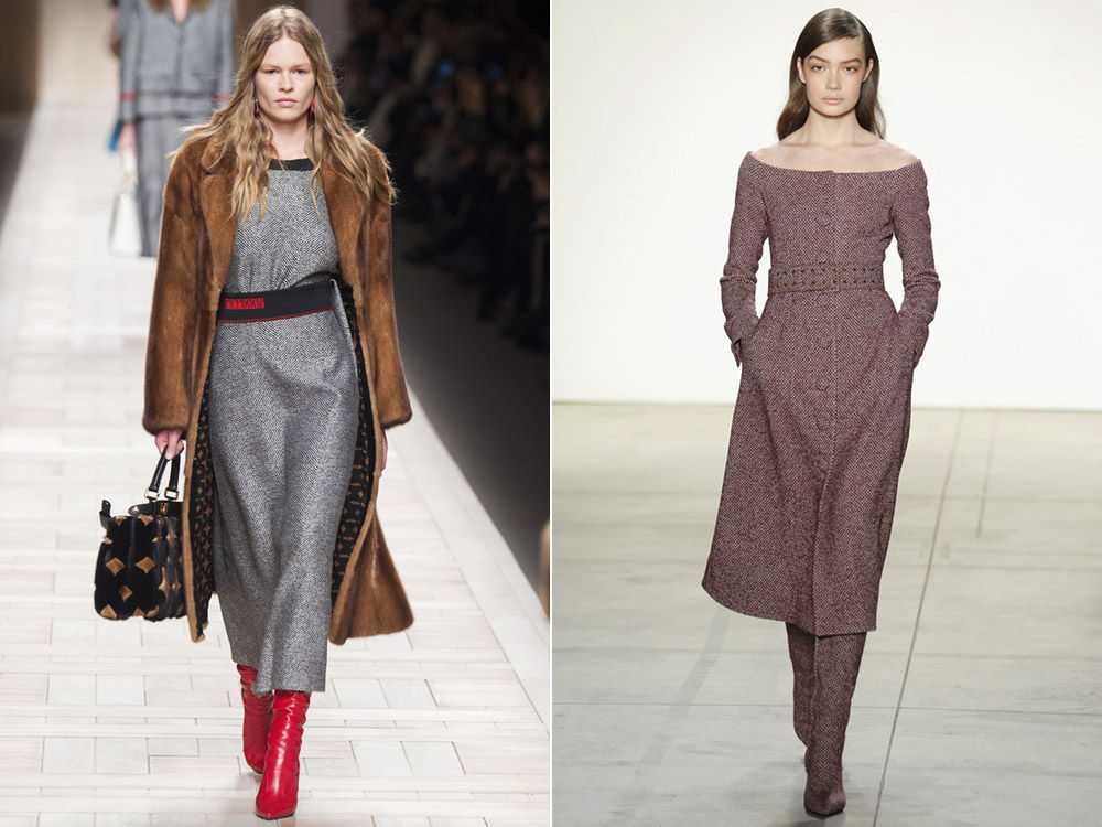 Атласные платья дизайнеры представили в бельевом стиле, с расцветкой деграде и акцентной бахромой. Они подойдут для вечерних аутфитов наилучшим образом. А вот для деловых мероприятий лучше выбрать твидовые вариации, особо сочетаемые с пальто. Также допустимо экспериментировать с комбинациями разных материй.