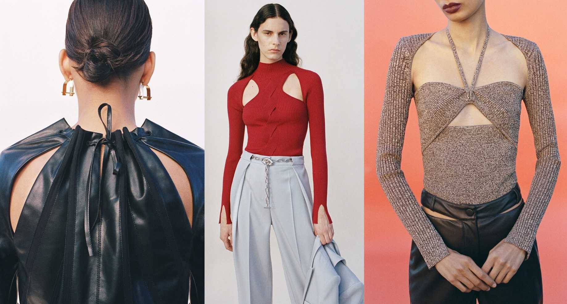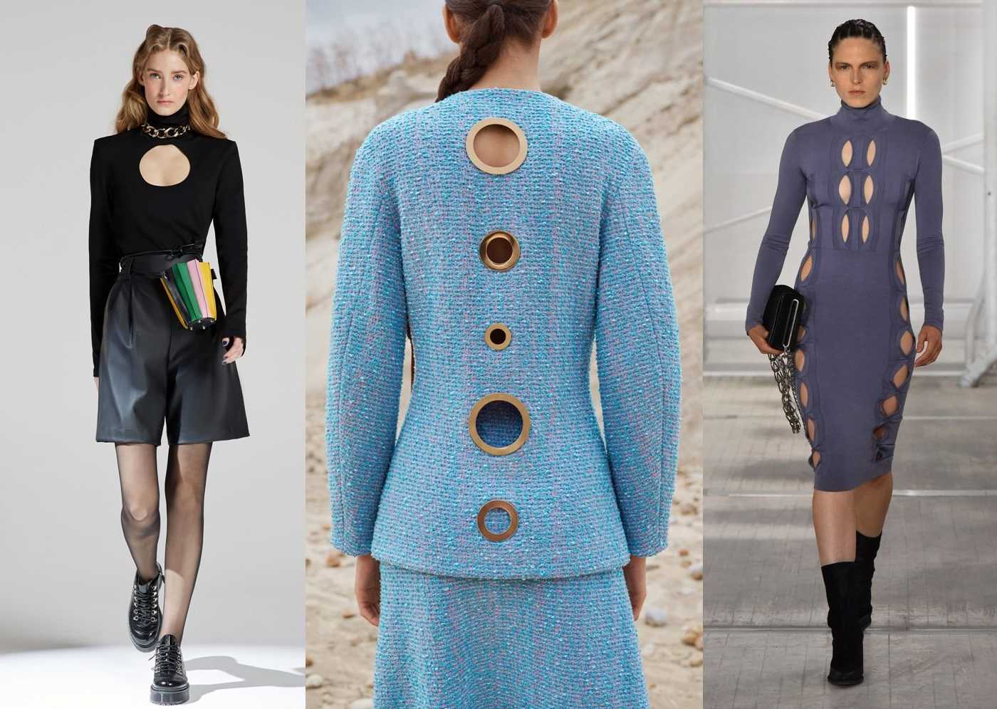 Еще одна модная и, кажется, не совсем сезонная, тенденция 2022-2023 — вырезы. Свитера, платья, юбки, топы, комбинезоны, колготы стали местом для разнообразных по форме и величине вырезов, который могут создавать целые узоры на одежде.