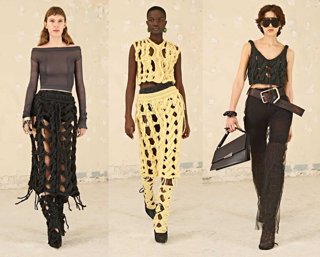 Эстетика кантри вдохновила модельеров на создание платьев крючком. Кружевные, сетчатые, выполненные в технике кроше, платья выглядят, словно сошли с плакатов о крестьянской жизни. Белые, вязаные крючком, модели показали Dior, Celine, Alexander McQueen.
