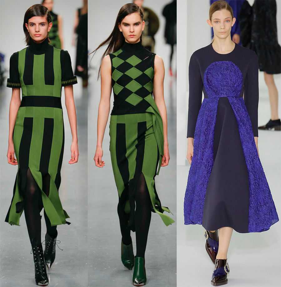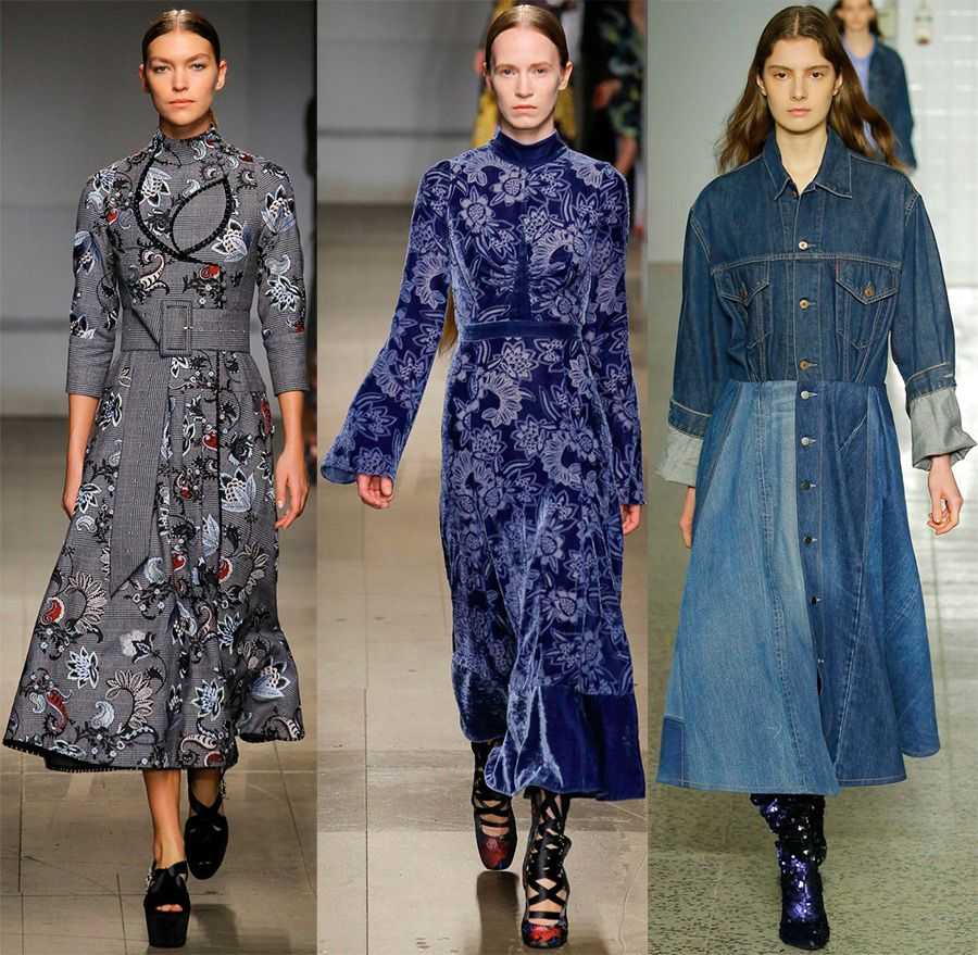 Прохладной осенью и зимой необходимы платья из плотных тканей. К ним относятся костюмные ткани с шерстью, букле, твид. На подиумах встречаются модели в платьях с отделкой из меха. Модельеры предлагают следующие ткани: теплый трикотаж, кружево, матовая кожа, жакард. Погодные условия осенью и зимой заставляют одеть что-то теплое и комфортное. Дизайнеры предлагают на это время года большой выбор платьев, которые, несмотря на более плотный материал, подчеркнут женственность и красоту.