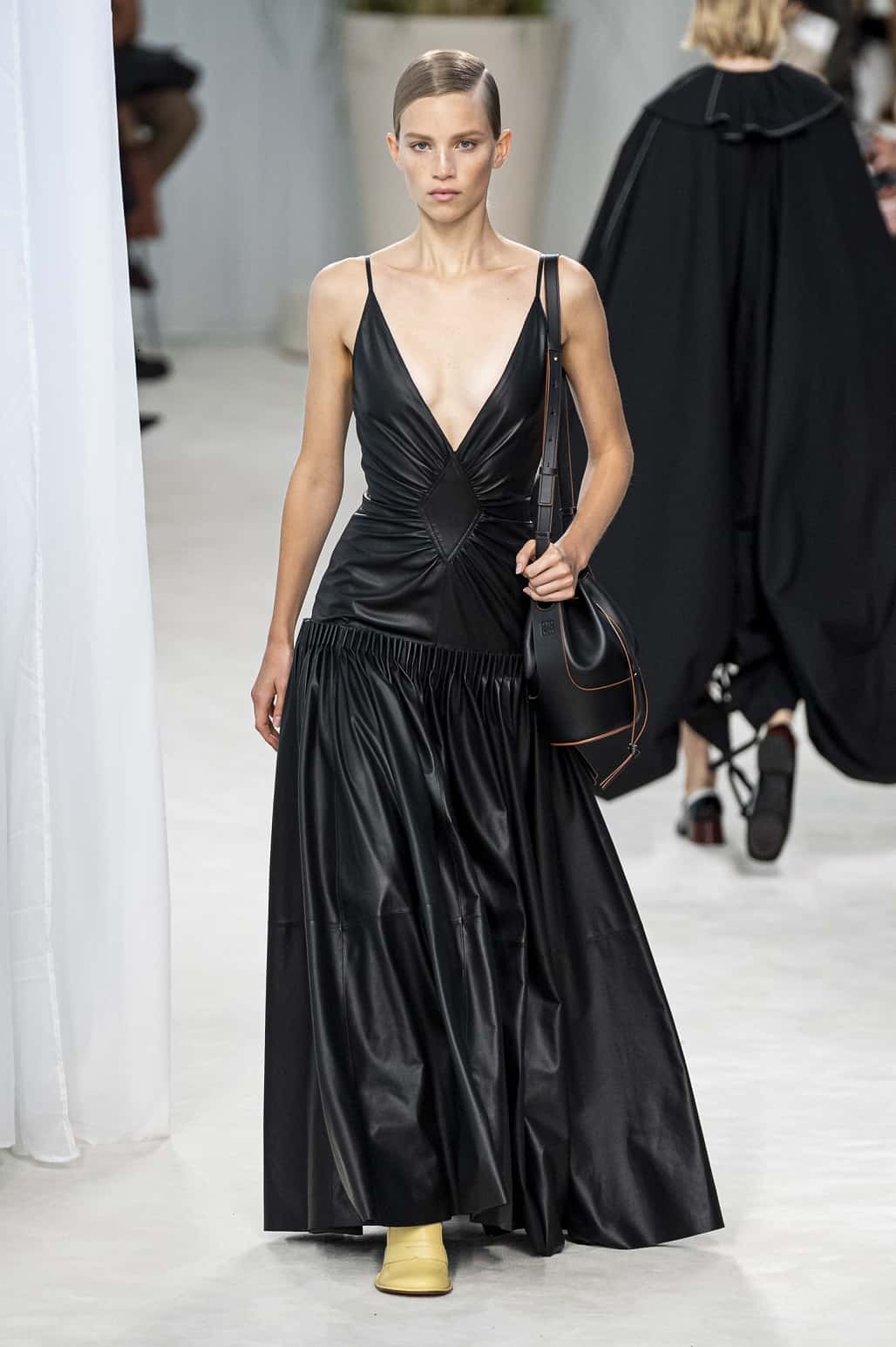 Платья в бельевом стиле все так же в тренде, особенно соблазнительные комбинации на тонких бретелях и с низким декольте. Тенденцию подхватили Stella McCartney, Saint Laurent и другие дома моды. Модели из шелка и атласа, с полупрозрачными вставками и кружевом оставьте для вечера, а для повседневной жизни подберите оригинальные кожаные платья на тонких бретелях, примерно, как у Loewe, но можно еще скромнее.