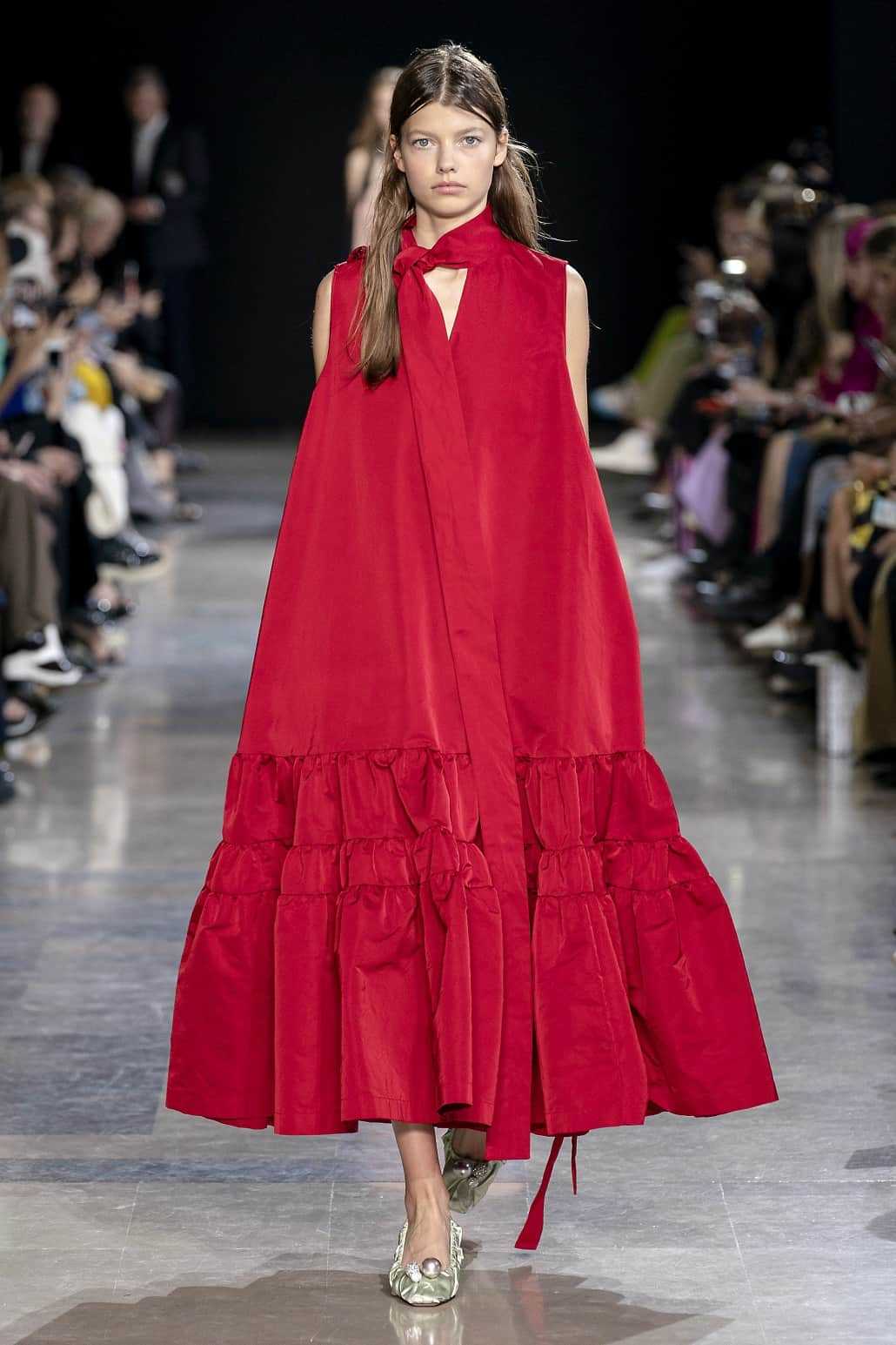 На неделях моды, посвященных весне-лету 2022, первую скрипку играли платья-макси. Самым удивительным фасоном можно назвать «колокольчик» – платье А-силуэта с пышными оборками внизу. Фасон продемонстрировал дом Rochas, их красное платье глубокой длины-миди произвело настоящий фурор.