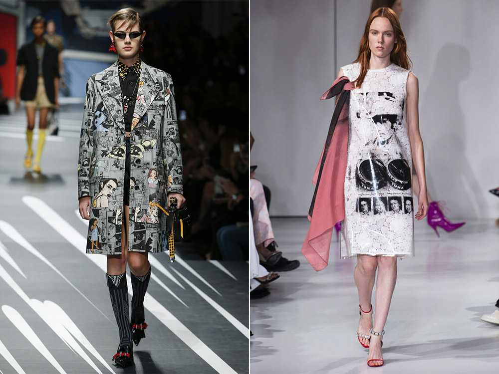 В тренде одежда, полностью усеянная принтами в стиле поп-арт или с одним изображением, эффектно контрастирующим на однотонном фоне. Причем это может быть и плотный плащ строгого классического покроя, и легкое прямое платье-футболка без рукавов. Интересная идея от Calvin Klein – черно-белые изображения из рекламных ретро-плакатов на полупрозрачных материалах с эффектом кружевной ткани.