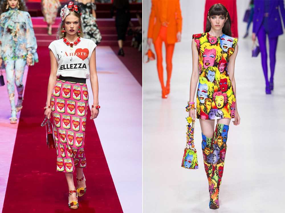 Versace и Prada предложили total look с принтами поп-арт. Если ты соберешь весь наряд с изображениями, напоминающими вырезки из плакатов 50-х-60-х годов, то ты будешь выглядеть не только оригинально, но и модно. Белые майки с надписями и трикотажные юбки миди с сочными оттисками этикеток из прошлого – безоговорочный хит этой весны.