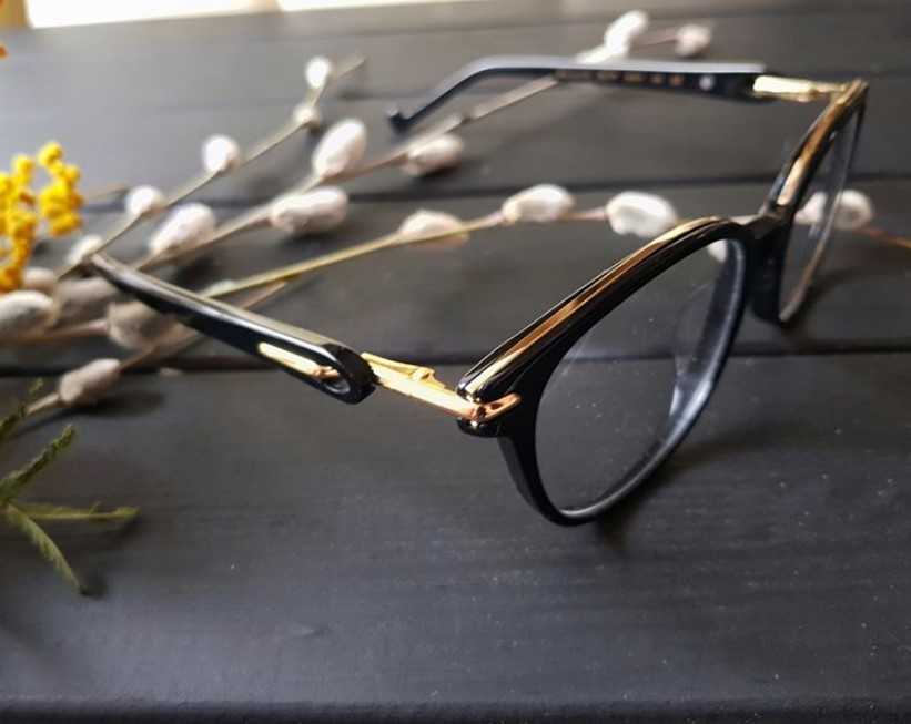 • Использование золотых вставок в пластик – на дужках, в угловой зоне или в районе верхней части с перегородкой на переносице может присутствовать элемент позолоты, выигрышно утопающий в черном фоне матового или глянцевого основного пластика.• Двуцветная композиция – окантовка линз может быть одного цвета, а сами дужки могут быть выполнены в другом оттеночном решении