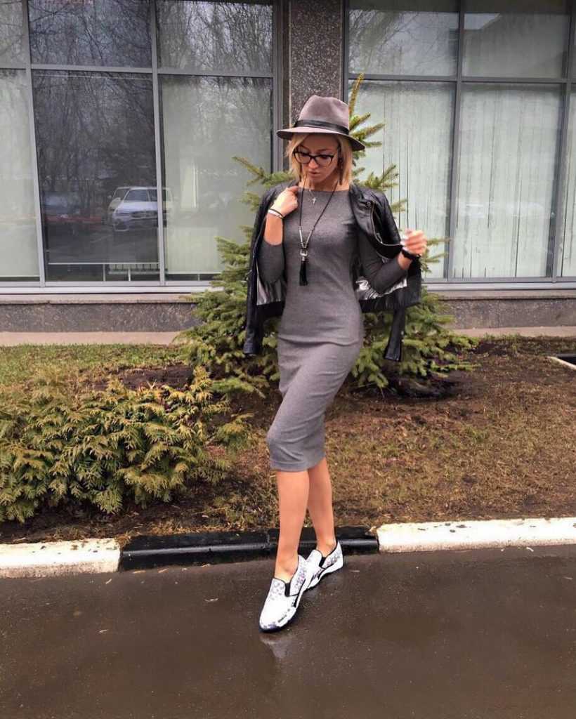 Модели-футляры лучше всего смотрятся с контрастными по цвету, низкими кроссовками, открывающими щиколотку. Это придает луку легкость, подчеркивает красивую форму ноги. Однако такое сочетание не подходит девушкам с короткой, плотной ножкой, в этом случае лучше выбирать наоборот массивные модели, в которых бы ножка казалась стройнее.