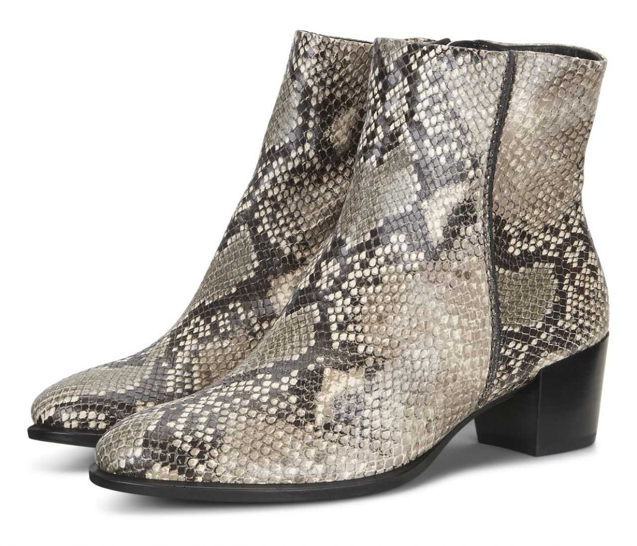 Новинкой брендов в 2019 – 2020 становятся модели с кожей рептилий. Предусмотрен толстый каблук небольших размеров. В силу своего окраса, данная модель превращает обычную девушку в дерзкую и грациозную модницу.