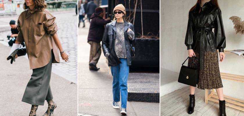 Рубашки свободного силуэта активно вошли в женский гардероб, в особенности кожаные. Такая рубашка отлично подойдет для прохладной погоды. Под нее легко можно надеть теплый свитер или худи. Она одновременно хорошо сочетается как с кроссовками, так и с обувью на каблуке. Кто устал от косух, может присмотреться к такому варианту. Некоторые рубашки идут в комплекте с поясом, что очень удобно при создании разных образов. Хотим более женственный – подчеркиваем талию, более расслабленный – носим без пояса. У таких рубашек есть особенность: зачастую они идут с карманами на уровне груди – такие варианты не подойдут девушкам с большой грудью, так как значительно добавят объема. Ваш вариант – искать без карманов.