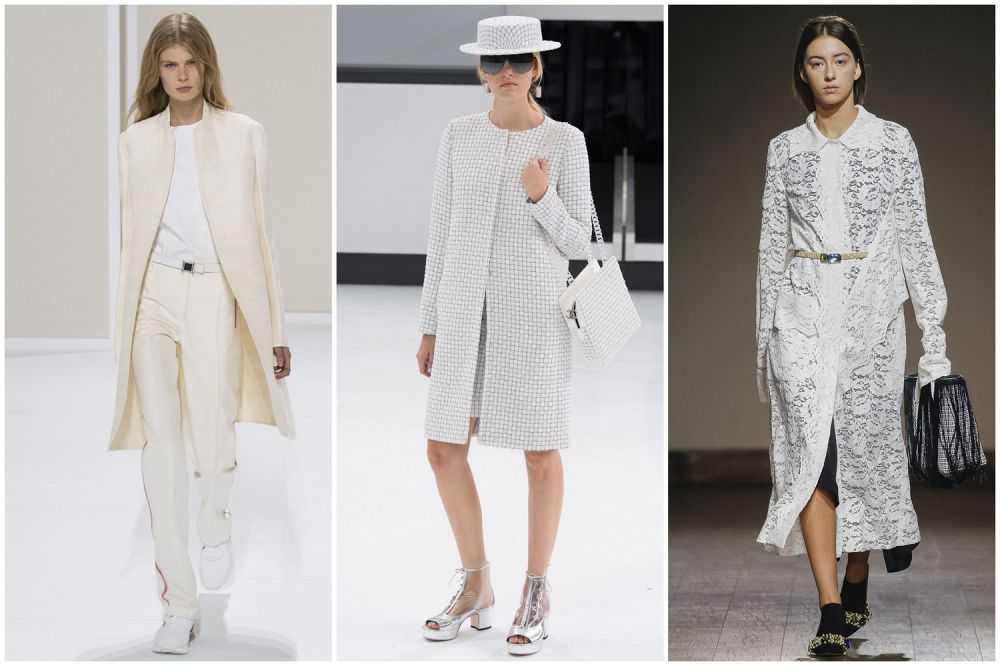 Модный дом Chanel предлагает укороченные модели пальто в белом цвете. Особое изящество верхней одежде от Chanel придает фактура ткани. Белый цвет воспринимается совершенно по-другому, рельефная ткань будто бы имеет пестрые вкрапления, и белое полотно кажется неоднородным.