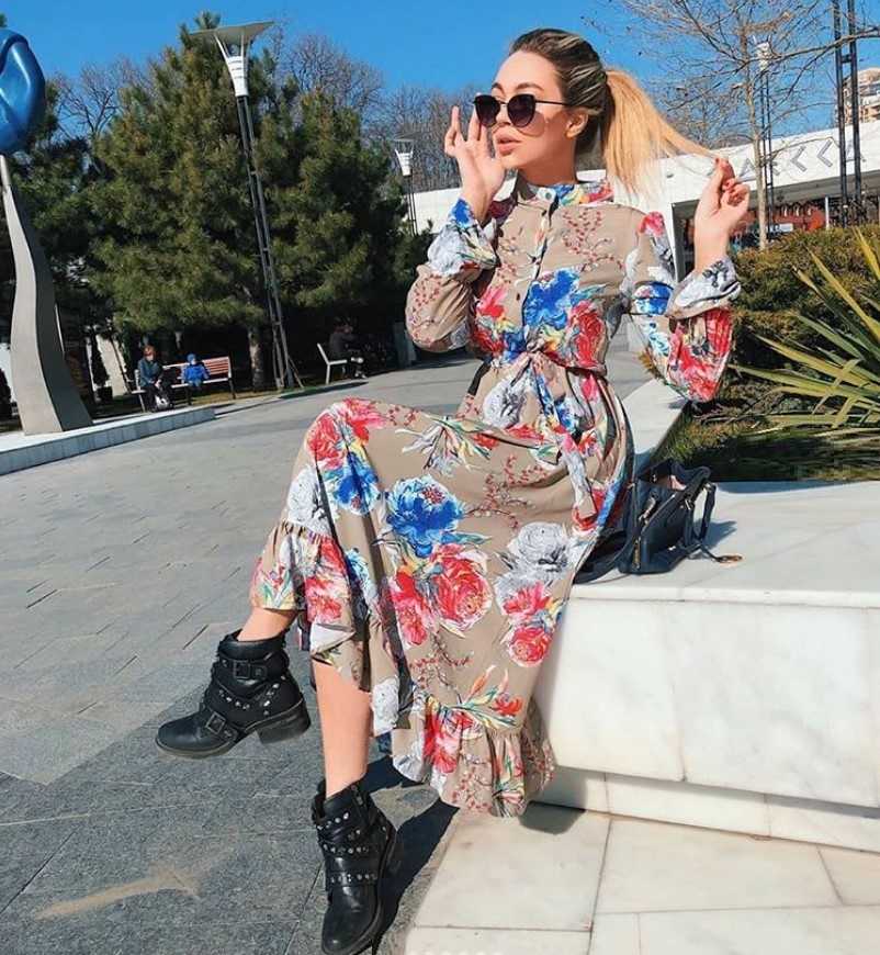 Также в весенне-осенний период возможно носить не длинные трикотажные платья, украшенные цветами. Ткань может быть полностью в цветах, либо украшены отдельные части изделия. Лук будет полноценным, если дополнить его полусапожками, сумкой и солнцезащитными очками.