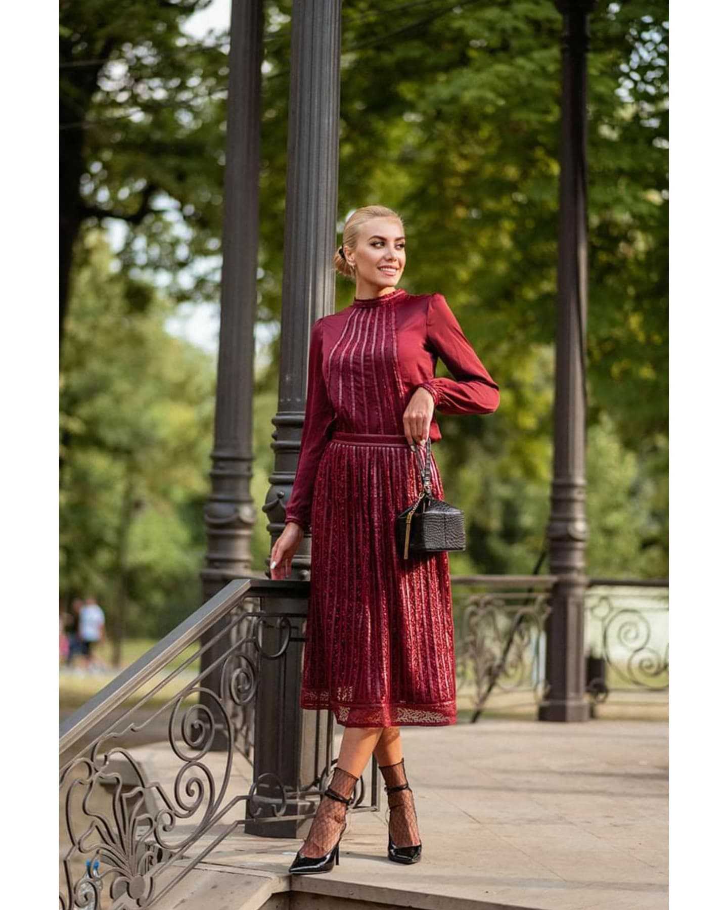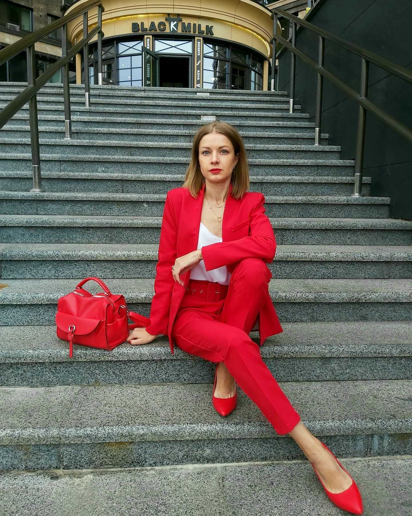 Алое пламя – приглушенный оттенок красного, который особенно красиво смотрится в праздничных образах. Например, платье в данном цвете отлично подойдет для вечеринки или торжественного приема.