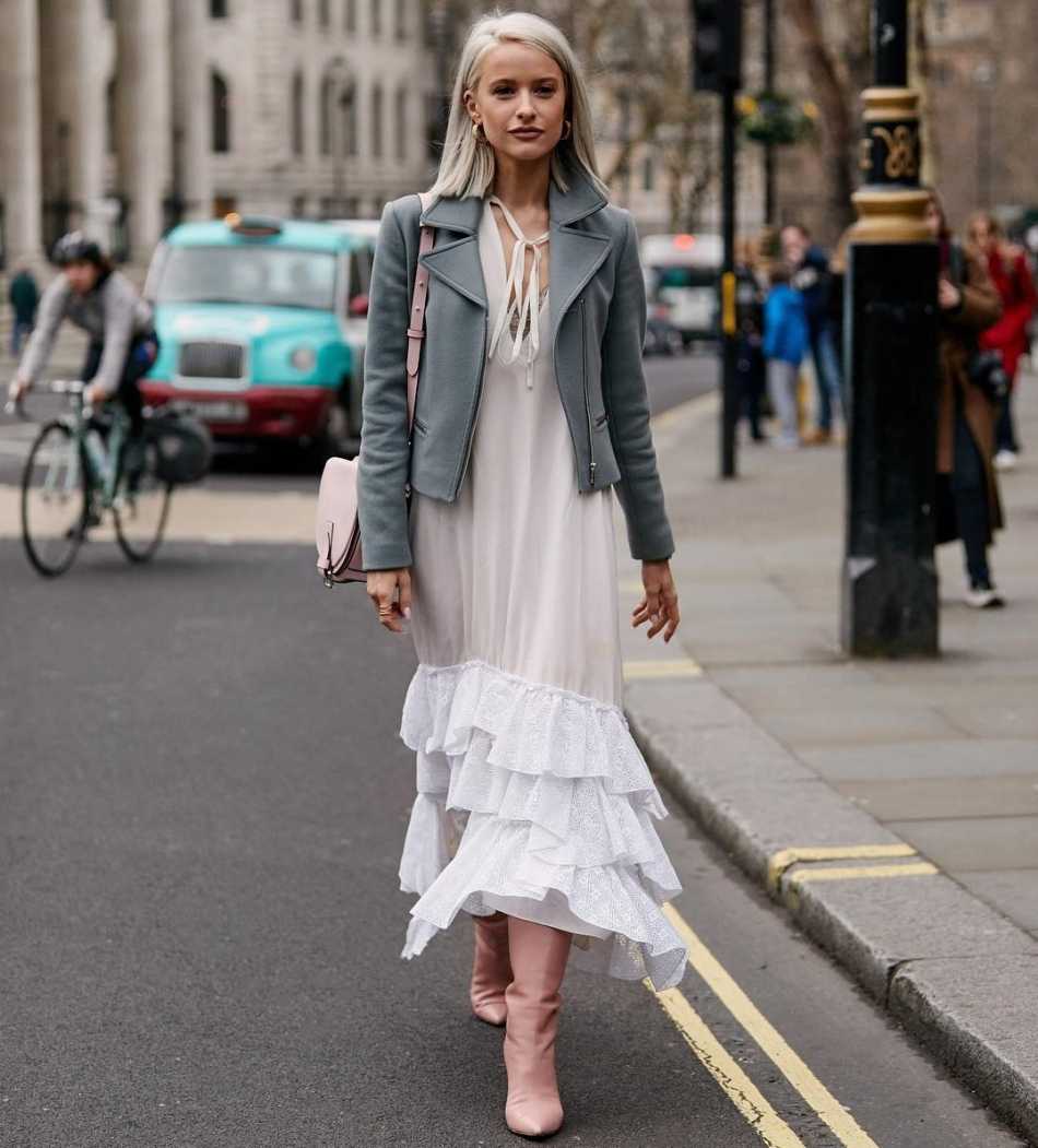 Это трендовое сочетание осени 2022 года. Любительницы платьев-комбинаций могут не отказываться от своей любимой одежды. Можно легко сделать летние вещи зимними, комбинируя их со свитером. Контраст между материалами выглядит очень эффектно, а наряд отличается легкой небрежностью. Можно добавить кроссовки или ботильоны, и повседневный образ готов.