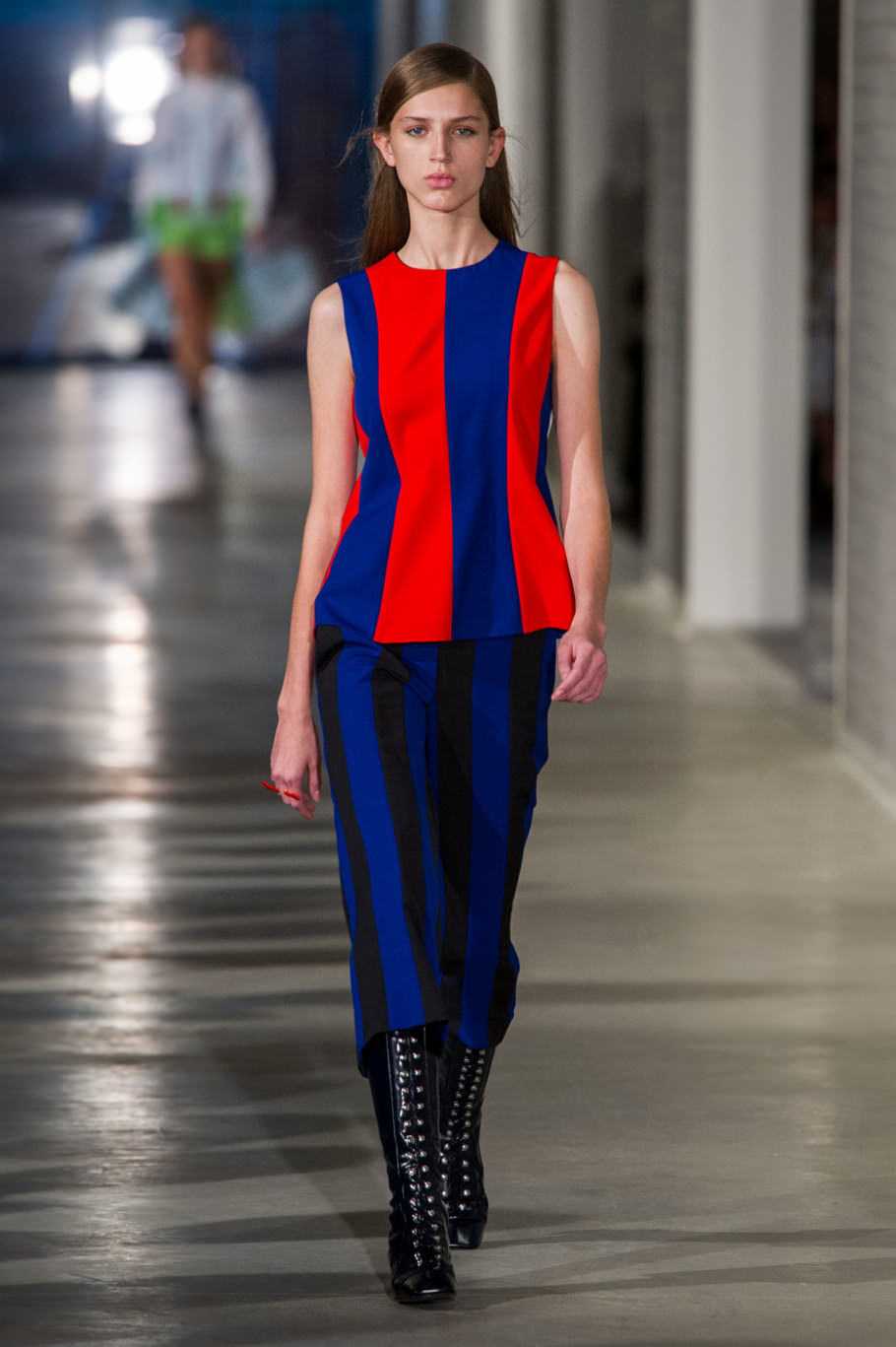 Полосатый переход. Как визуально разъединить части платья, сделать его похожим на костюм? Использовать два разных принта в верхней и нижней части. Смотрим у Arthur Arbesser, Prabal Gurung.