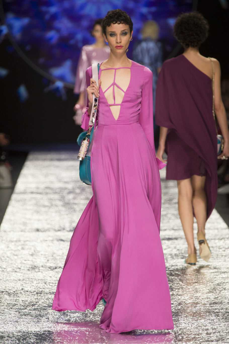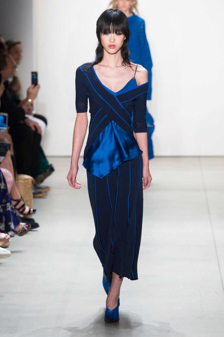 Смелость и свобода прослеживаются в фасонах Monse, Giambattista Valli, Elie Saab – открытые плечи, высокий шлиц, свободный крой юбки, не стесняющей движений. Интересна также игра цвета – контрастные детали, составляющие единое целое, и мягко переходящие оттенки синего. Женская фигура очерчена правильно, несмотря на асимметрию лифа.