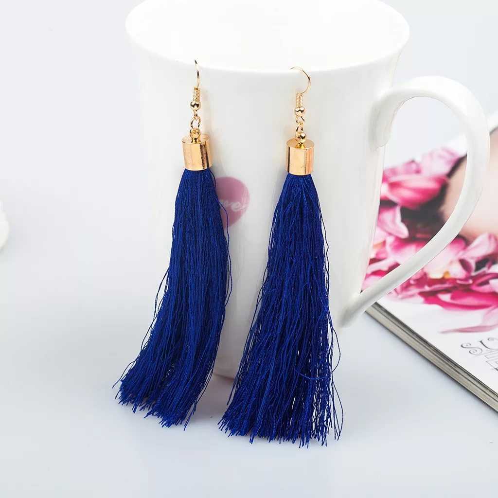 • серьги с бахромой – невероятным трендовым веянием уже не первого сезона являются удивительные серьги в виде пучка лоснящихся атласных нитей, которые блестят своим великолепным гладким бликом в разных цветовых решениях. Ниспадая на плечи, длинные пучки серег в виде бахромы идеально подходят под вечерние платья и коктейльные наряды;• инкрустированные серьги – очень дорого, респектабельно и фешенебельно смотрятся украшения в ушках прелестниц в виде ниспадающих на плечи удлинённых переплетений из совокупности чарующих магическим блеском дорогих камней: глубокий малахитовый изумруд, насыщенный алый опал, глубинный синий сапфир, бордовый рубин – выполненные в серебристой или золотой оправе такие серьги смотрятся беспредельно аристократично и буржуазно.