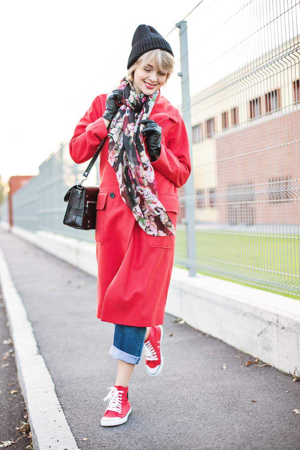 Яркий шарф – главный аксессуар, идеально подходящий к простому серому пальто.