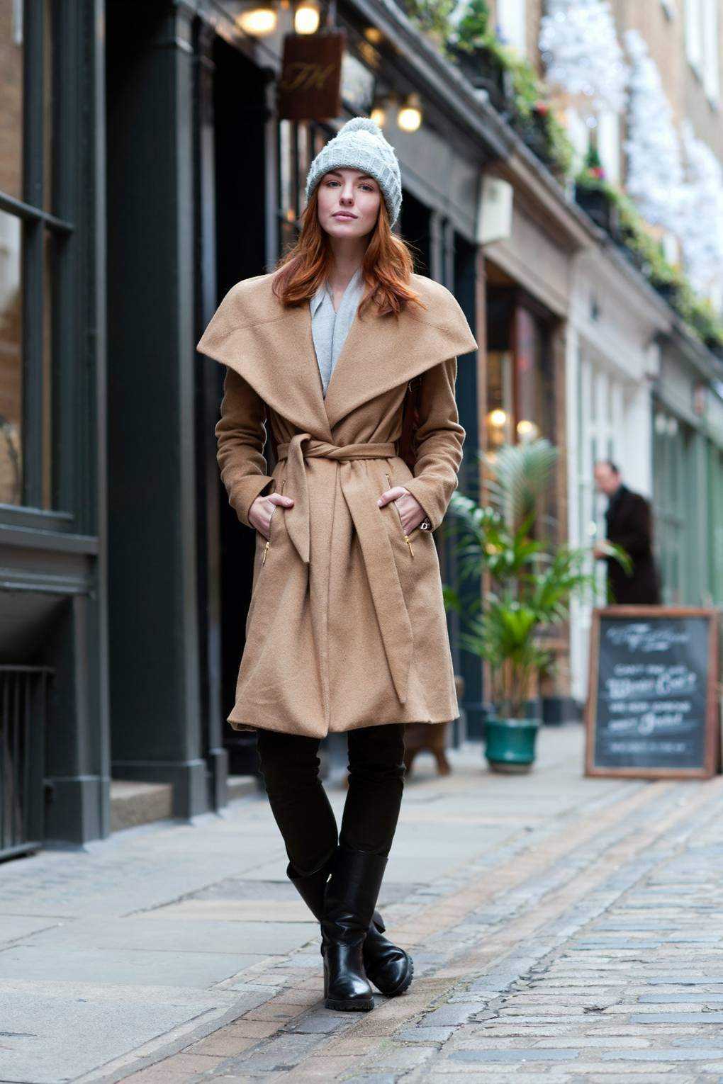 Многие считают эту модель пальто не универсальной, так как она действительно похожа на халат. Но, у нее есть характер классического пальто. Речь идет о запахе. Эта деталь делает образ максимально женственным! Будьте аккуратными при создании образа. Если носите пальто с кроссовками — верхняя одежда должна быть распахнутой. Дополнительно утеплиться поможет вязаная шапка нейтрального цвета и палантин. Не пренебрегайте многослойностью даже при создании стиля smart-casual.