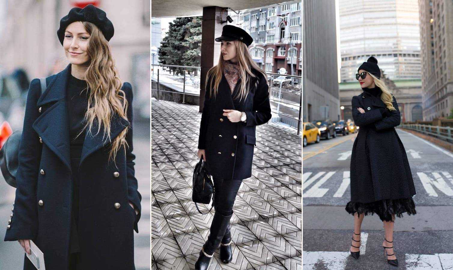 Чёрное. Так как чёрное пальто является самым универсальным, к нему подойдет практически любая шапка. Например, с базовым двубортным хорошо будет смотреться кашемировая или вязаная модель такого же цвета или абсолютно контрастного. Также можно дополнить его изысканной фетровой шапочкой. А вот к вариантам в стиле милитари подойдут спортивные бини или же брутальные ушанки.