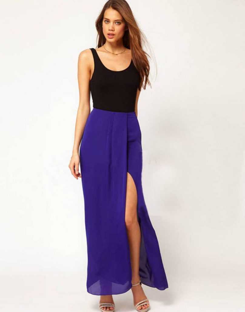 Юбка в пол с запахом летом будет не менее актуальна, нежели мини. Она может быть прямой, расклешенной, в складку и т. д. Обычно такие юбки бывают однотонные. При этом акцент делается на ярком верхе или интересных аксессуарах. Длинный разрез, который обнажает ножку до уровня бедра, внесет в образ нотки сексуальности.
