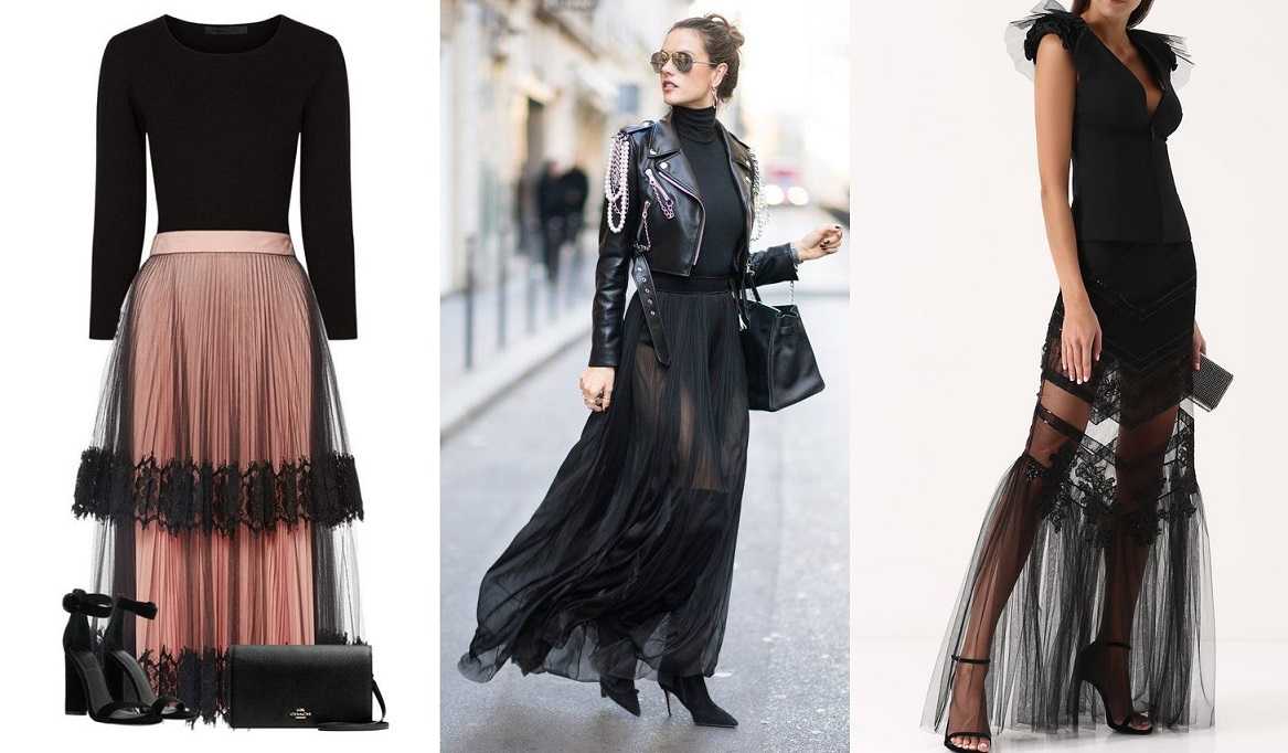 Смелый, слегка эпатажный, но очень стильный вариант – прозрачное «макси», сшитое из шифона или кружева. Это идеальный вариант для вечернего или особого выхода. Комбинировать такие модели дизайнеры рекомендуют с очень демократичными или брутальными короткими топами.