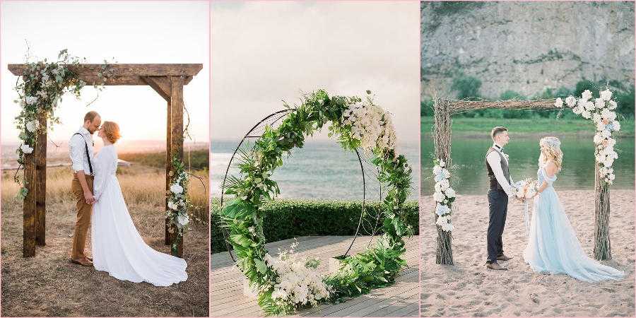 Выездные церемонии брака очень распространены в последние годы и на них главный атрибут – это, конечно, красивая свадебная арка. Если пару лет назад можно было встретить такой аксессуар, декорированный только цветами и тканью, то сегодня они бывают самыми различными, от классического цветочного варианта до шедевра, сделанного из дерева. Формы их тоже различаются, в 2021-ом будут в тренде: