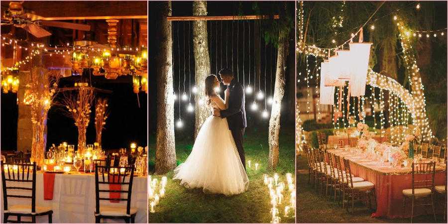 Светильники, светодиодные и неоновые лампочки, гирлянды – все это поможет создать Вам волшебную атмосферу на свадьбе в 2021 году.