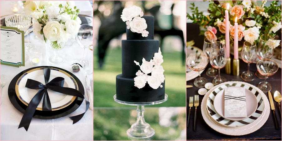 Черный давно перестал быть траурным цветом, и теперь многие дизайнеры предлагают его использовать в украшении свадебного торжества. Это могут быть какие-то отдельные элементы, например, подсвечники, воздушные шарики, торт, скатерть или салфетки. Ну а смелым невестам обязательно приглянутся платья с черными кружевными вставками.