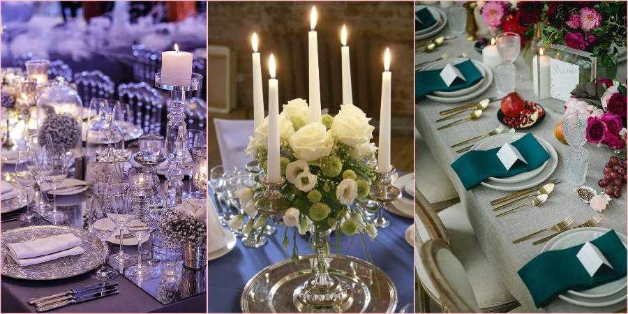 Сервировка – важная составляющая любого праздничного стола, а также часть концепции всей свадьбы. Проявите фантазию и украсьте стол красивыми высокими свечами, старинным столовым серебром, цветными скатертями, интересными салфетками.