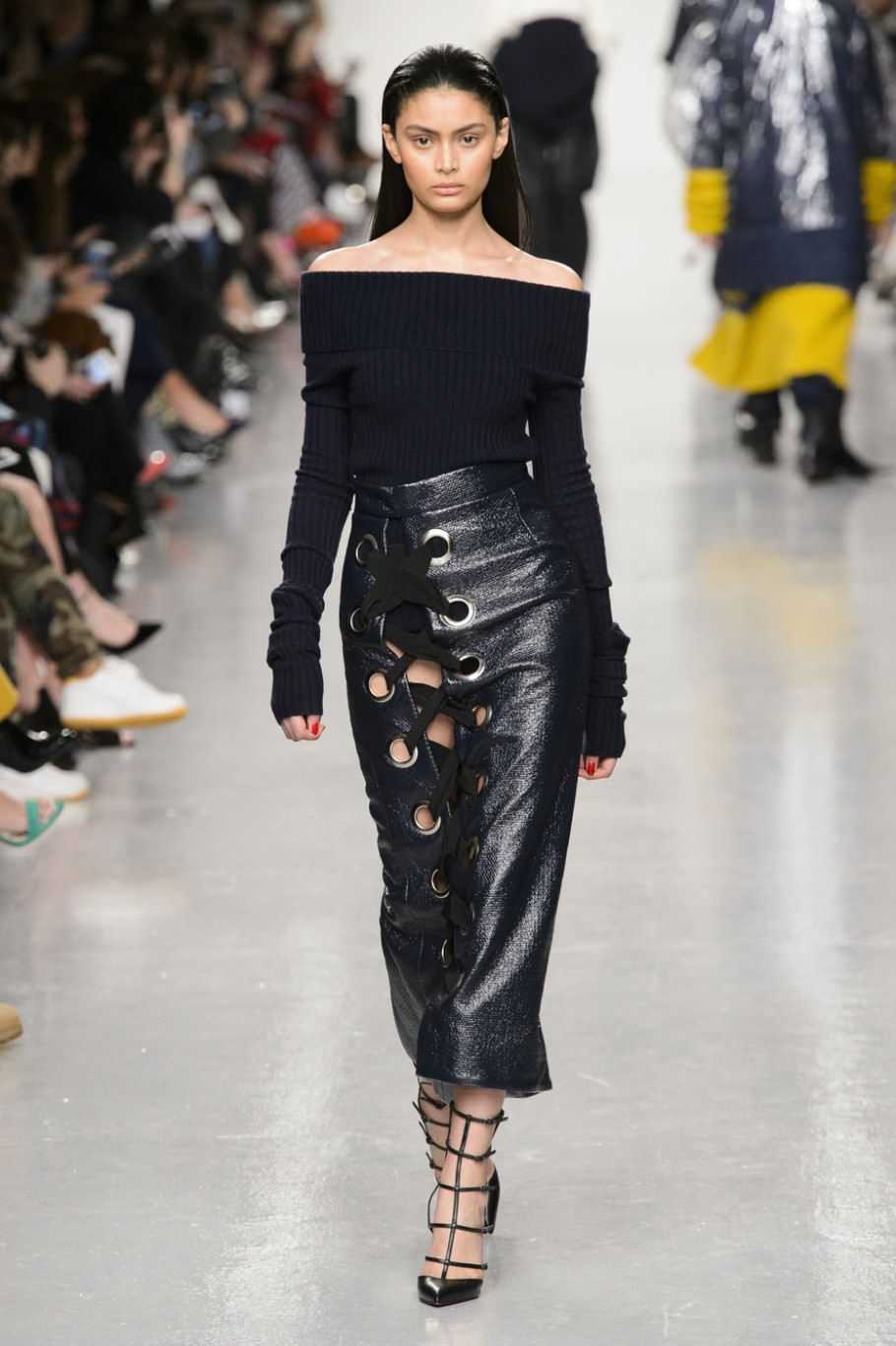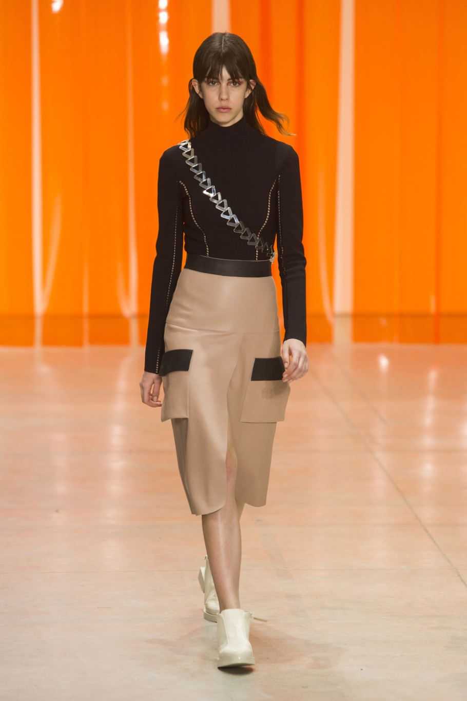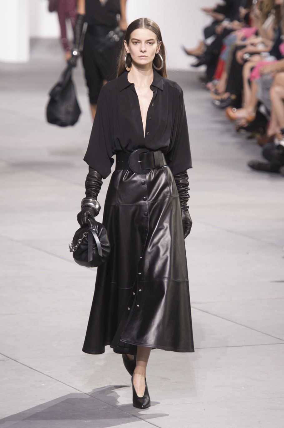 И несмотря на то, что черный цвет превалирует, на подиумах были замечены кожаные юбки ярких и светлых оттенков (Hermes).
