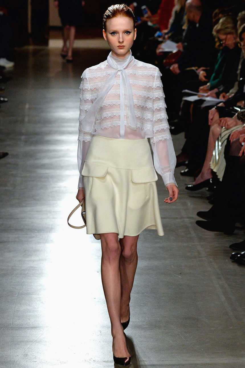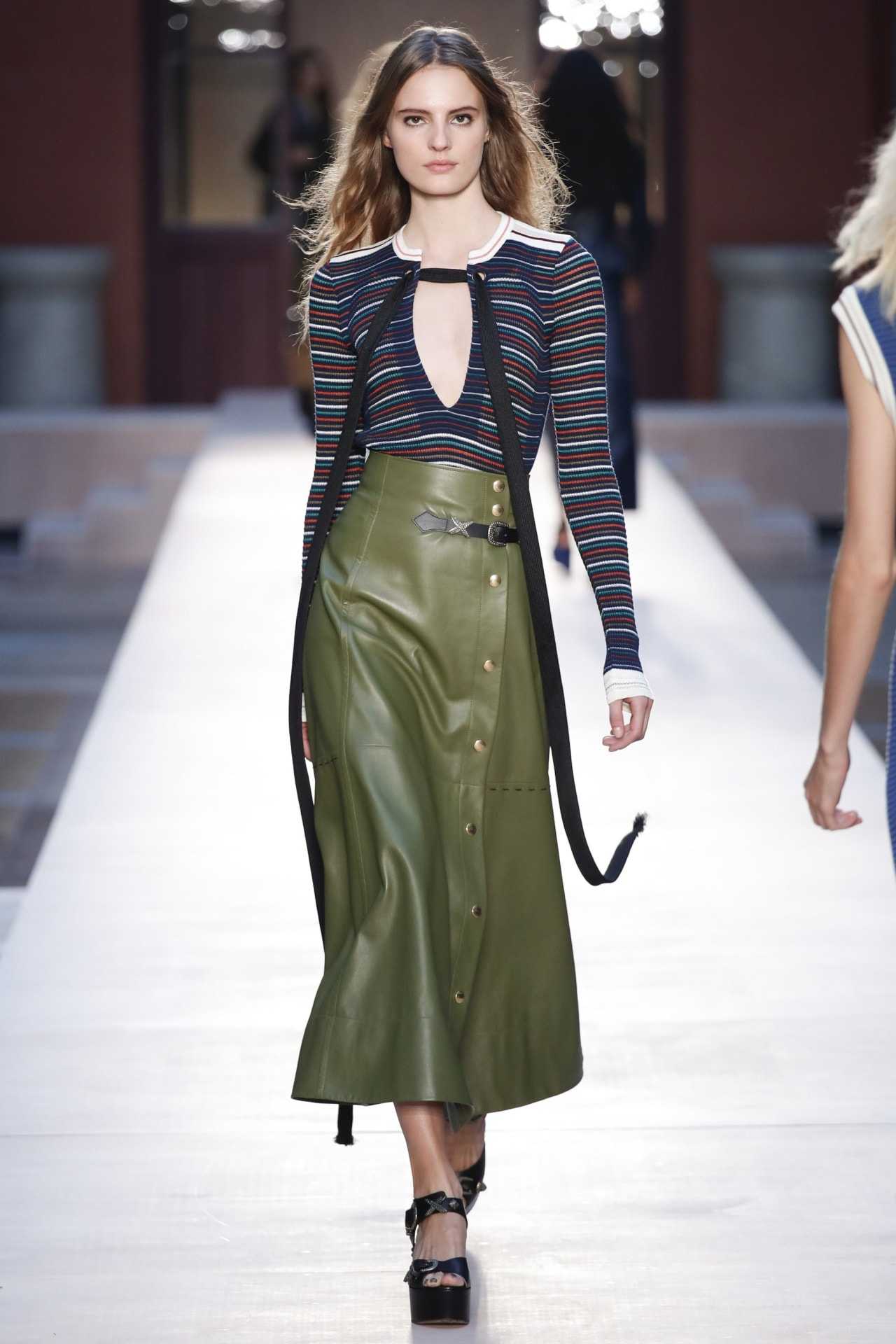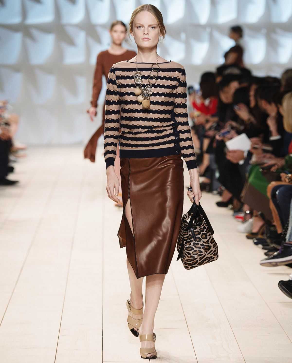 Некоторые модные дома использовали гофрировку локально. Этот тренд можно увидеть в новой коллекции от Versace, модельеры которого представили как традиционную складку, так и короткие гофрированные юбки, декорированные большими накладными карманами из кожи. Ну а эффектное кожаное плиссе в миди-длине представил дизайнер Tomas Maier.