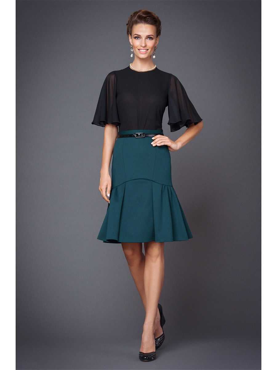 Обладательницы крупных бедер могут позволить себе юбки с запахом или баской. За счет таких элементов декора фигура будет казаться более пропорциональной.