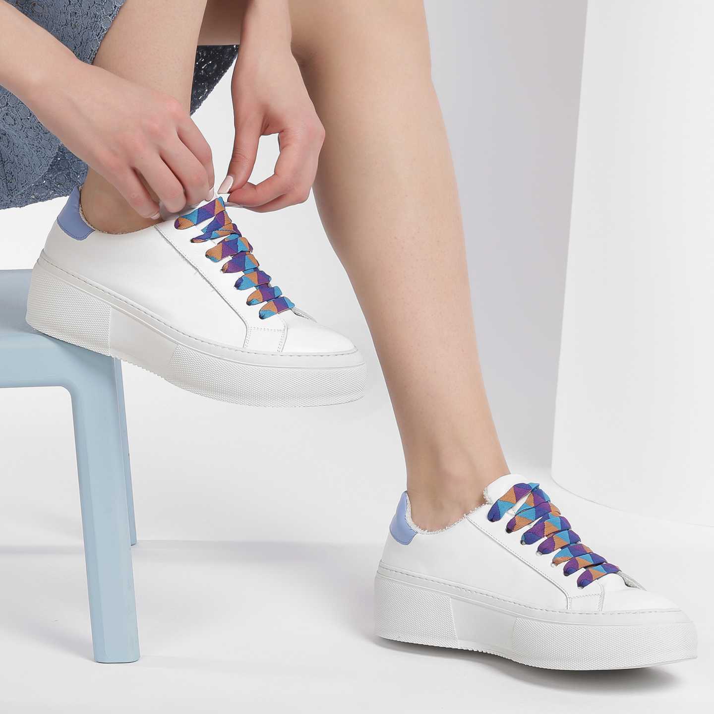У Coach мы видим бледно-голубые низкие кроссовки со светло-желтыми вставками и коричневой подошвой.