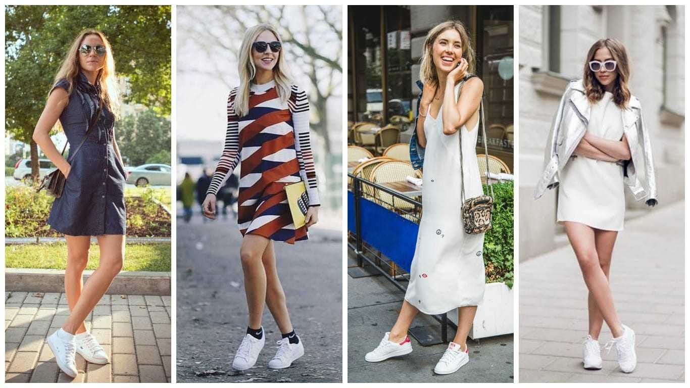 Простые белые кроссовки отлично подойдут к легким платьям. А также отлично комбинируют с жакетами и косухами.