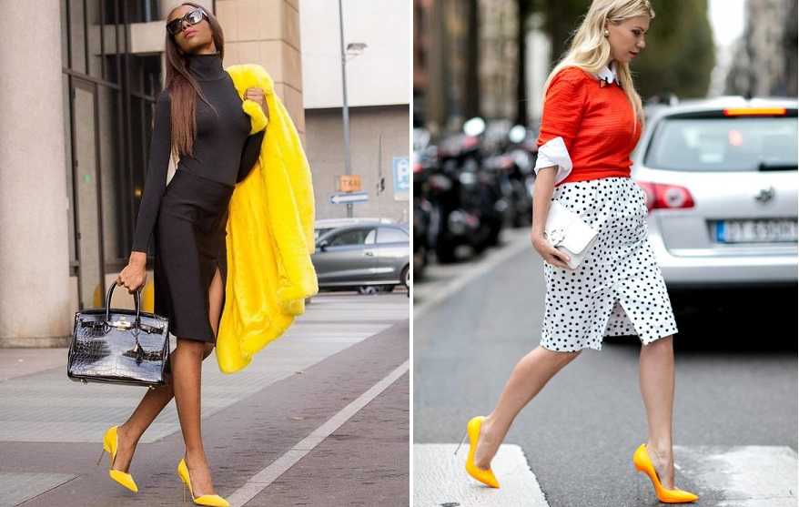 Выбирайте спокойную базу, к примеру, белую рубашку с классическим денимом, можно облачиться в классический синий костюм и добавить к нему лодочки яркого жёлтого цвета. Прекрасным вариантом будет черно-белый монохром и малиновые модные женские туфли. Обувь создаст модный акцент, но не будет казаться чересчур «излишней» на фоне спокойного верха.