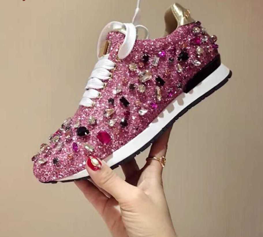 Любительницам ярких, броских нарядов подойдут кроссовки со стразами, камнями и блестками в серебряных или золотых оттенках.