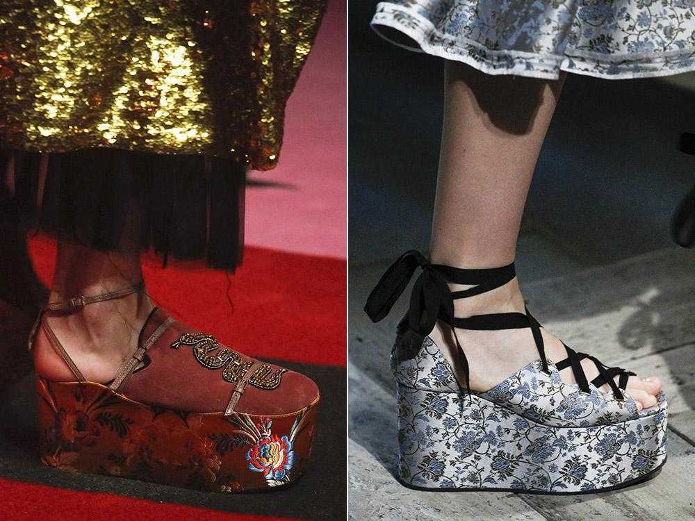 Ярким примером модного ретро с оттенком шестидесятых в этом году стала коллекция Miu Miu. Цветные модели обуви на танкетке и платформе порадуют самых отъявленных модниц.