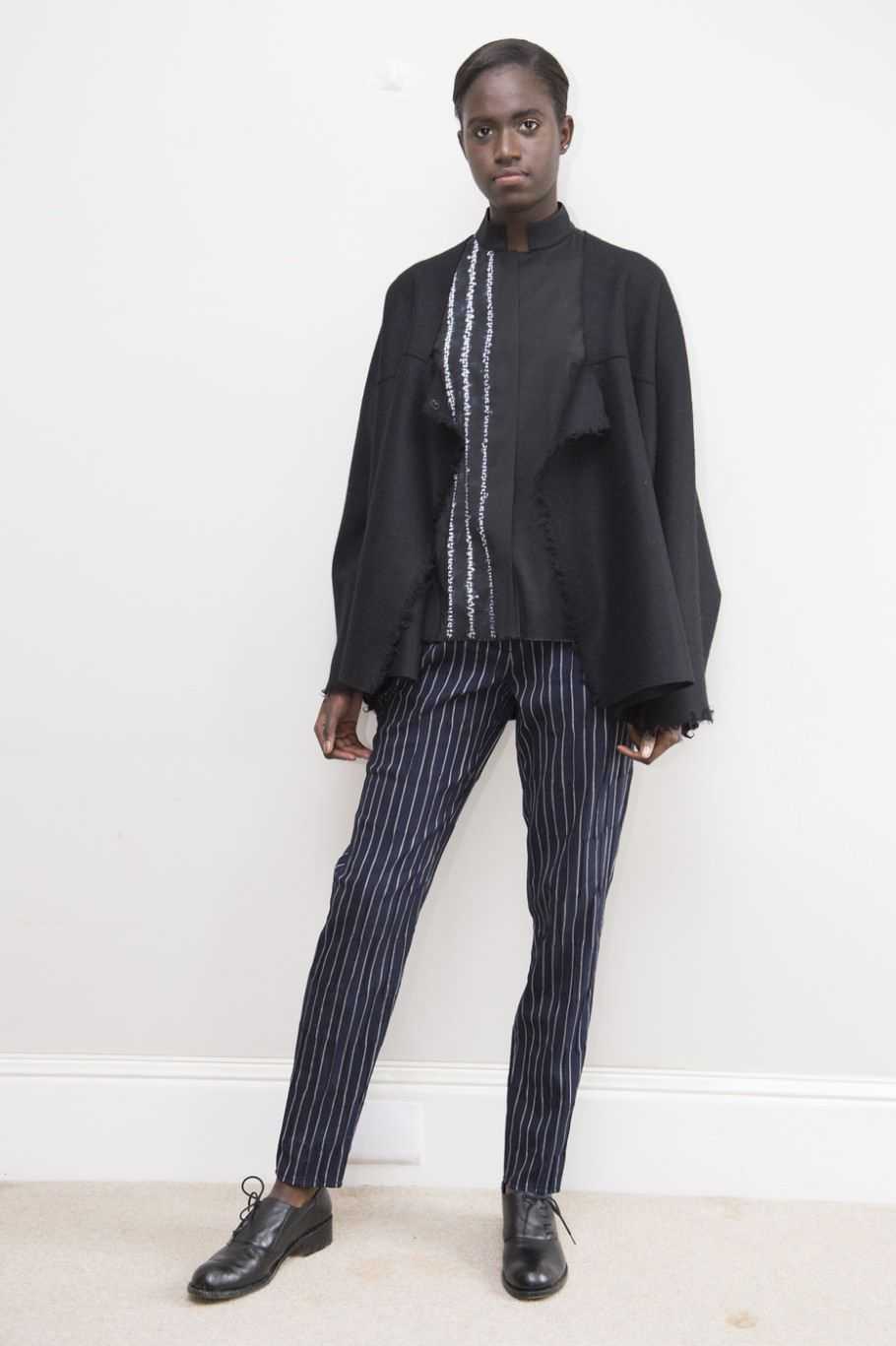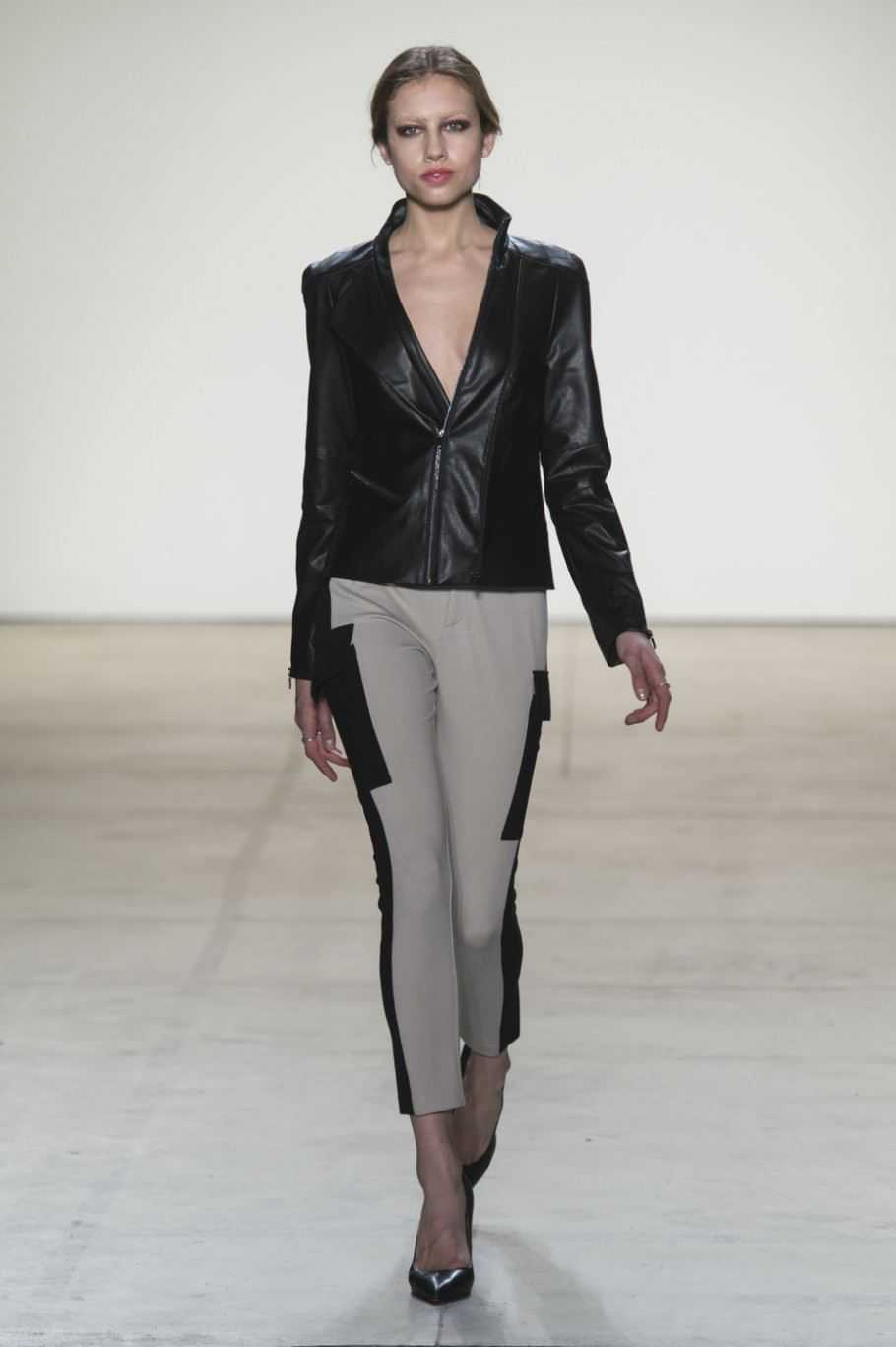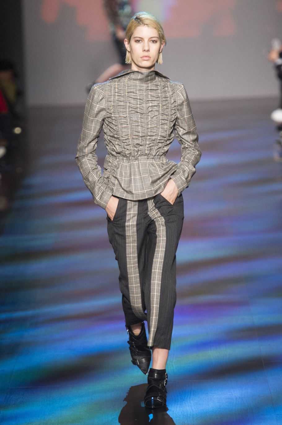 К примеру, модель брюк Vivienne Tam, представляет собой очень интересную композицию, состоящую, одновременно, из полос и клетки. Сложная геометрия не только не навредила образу, но и сделала его очень нетипичным для строгой классики.