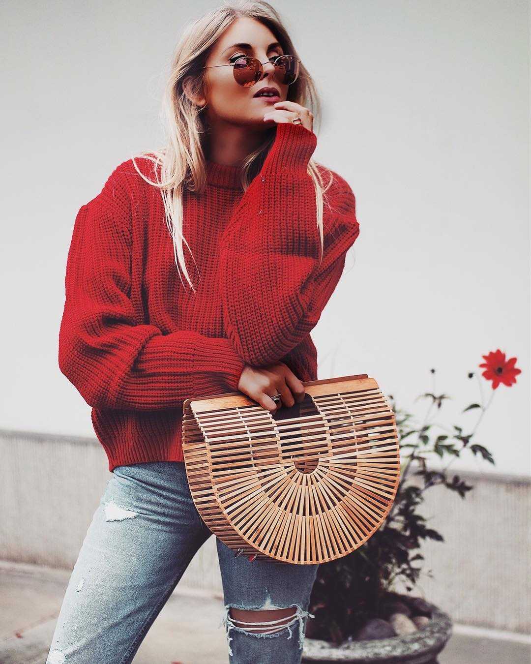 Мужской свитер и сумка с жестким корпусом — еще одно необычное сочетание. Свитер мужа и узкие джинсы — классика.